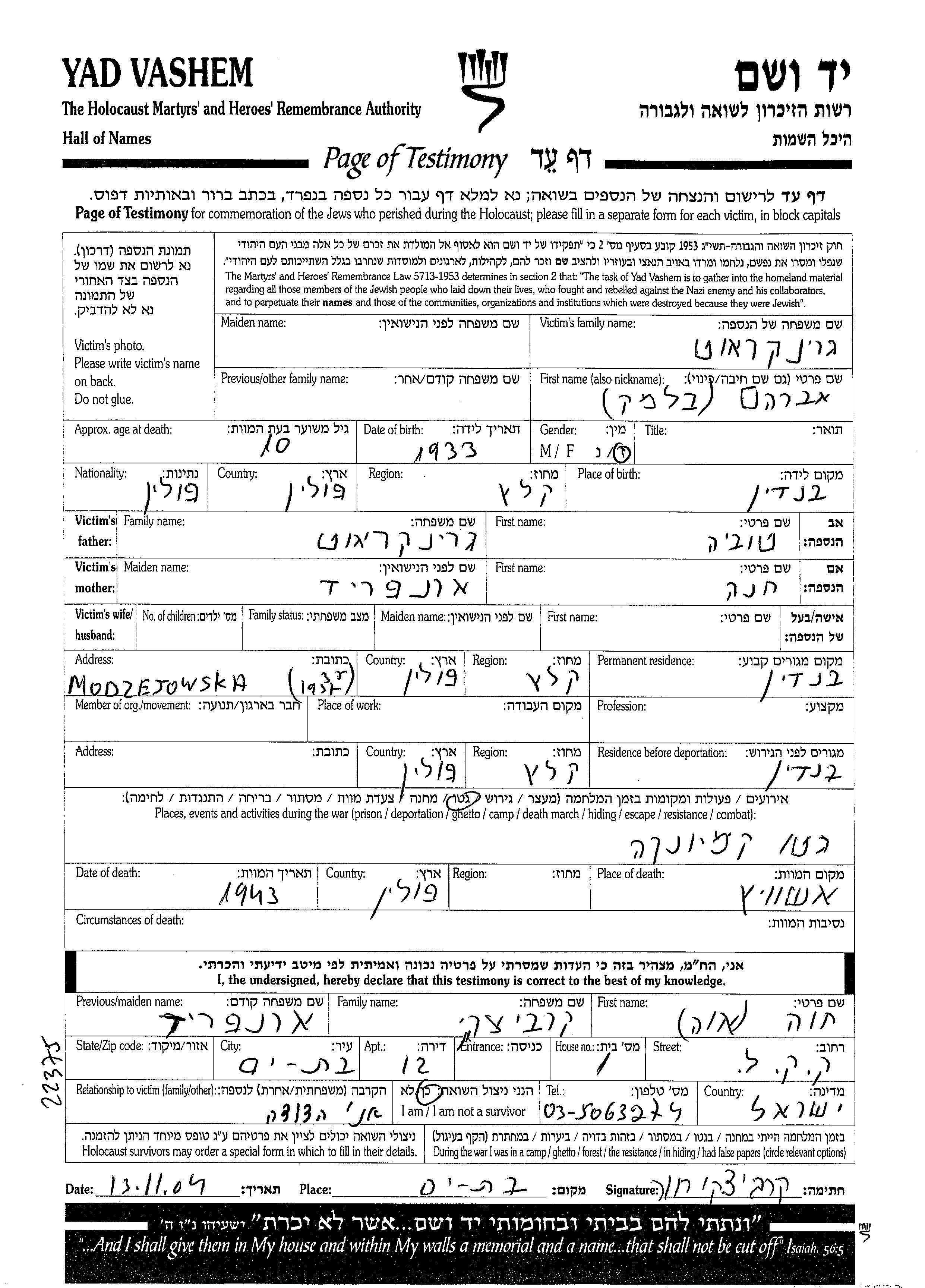 Гринкраут Авраам Бламек 1933 Бендин, Польша Лист свидетельских показаний (электронный)