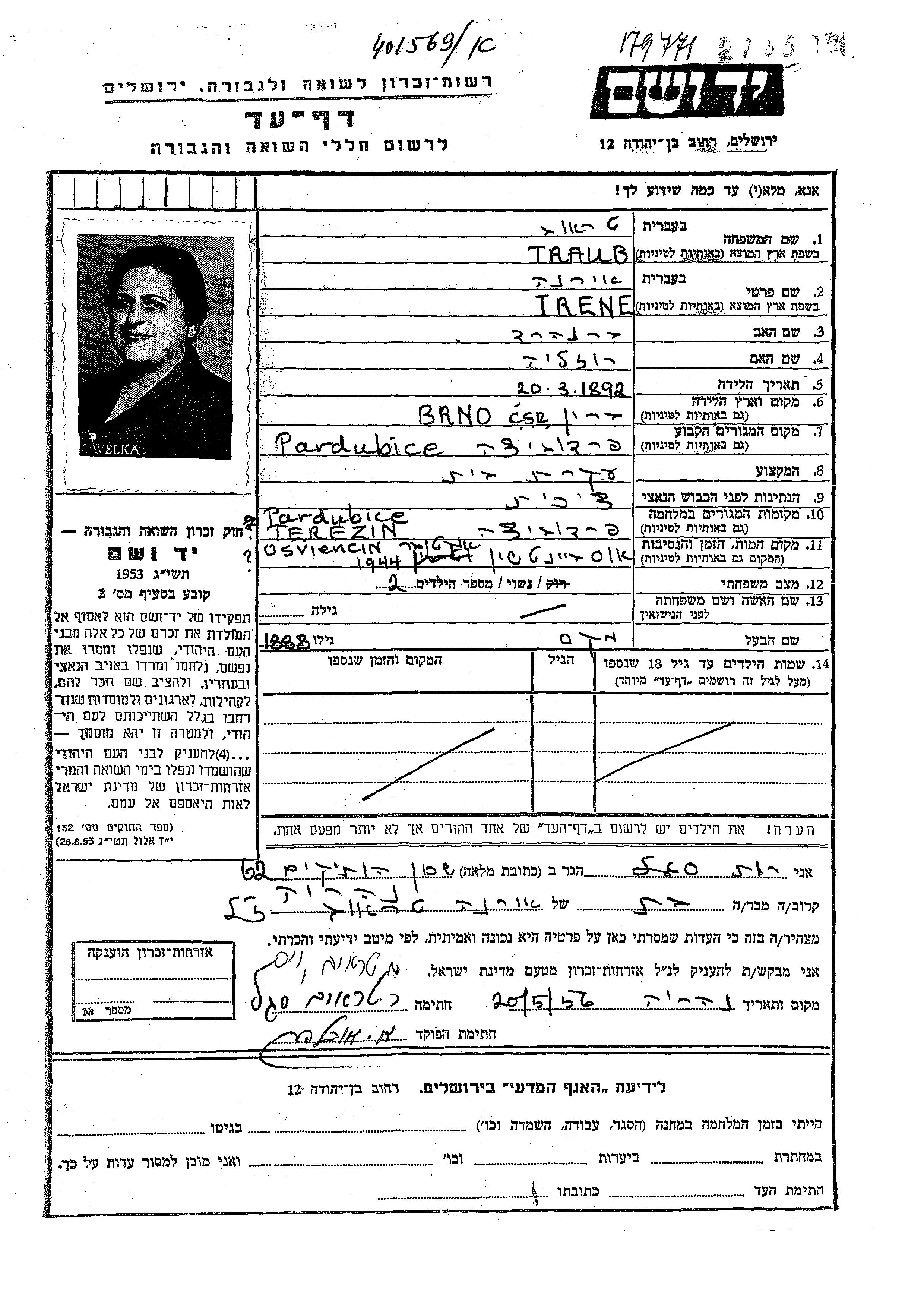 Ирена Трауб, место рождения: Брно, Чехословакия. Домохозяйка. Место жительства до войны: Пардубице, Чехословакия.