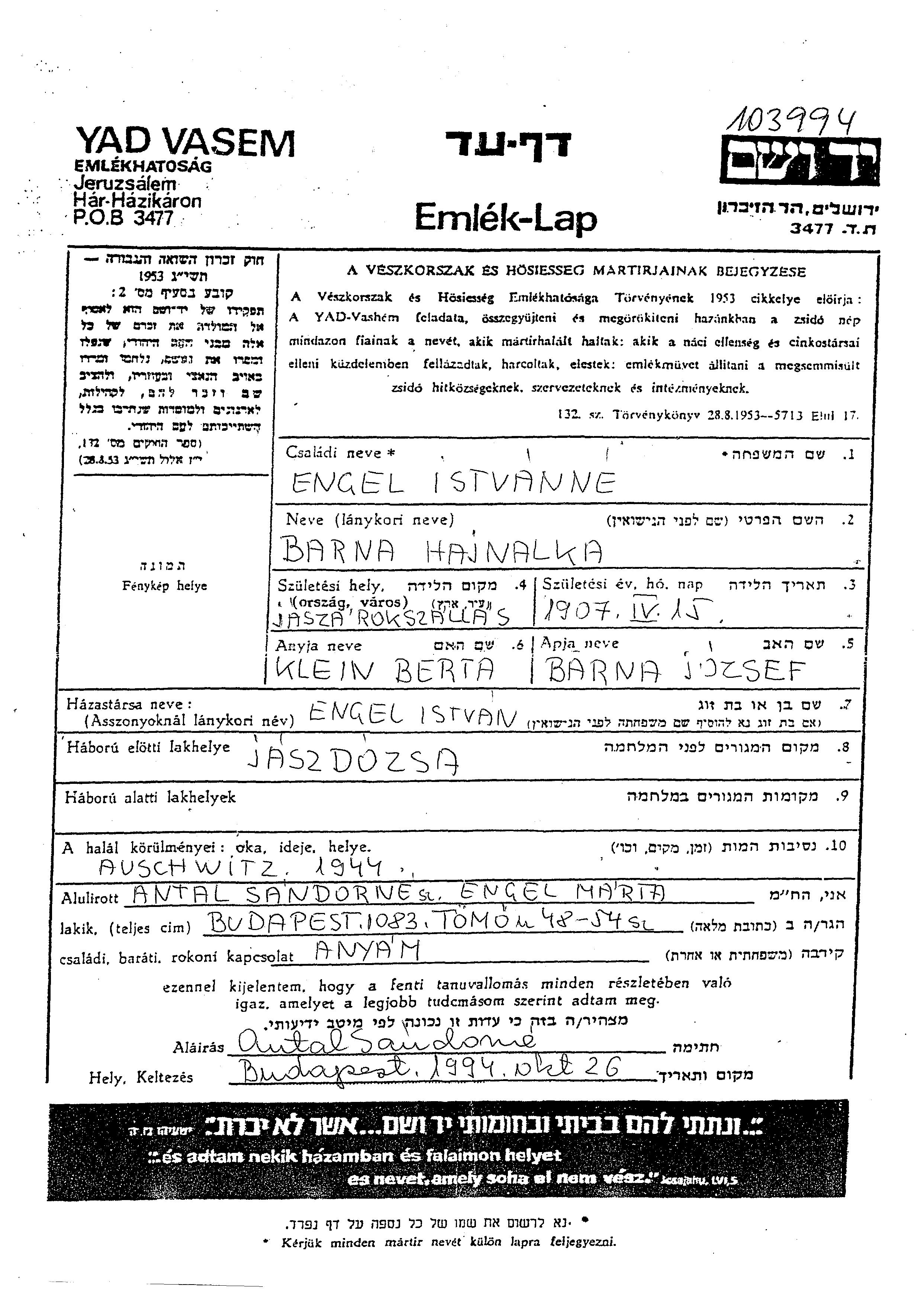 Хайналь Энгель, девичья фамилия Барна, место рождения: Ясароксаллаш, Венгрия. Место жительства до войны: Ясдожа, Венгрия.