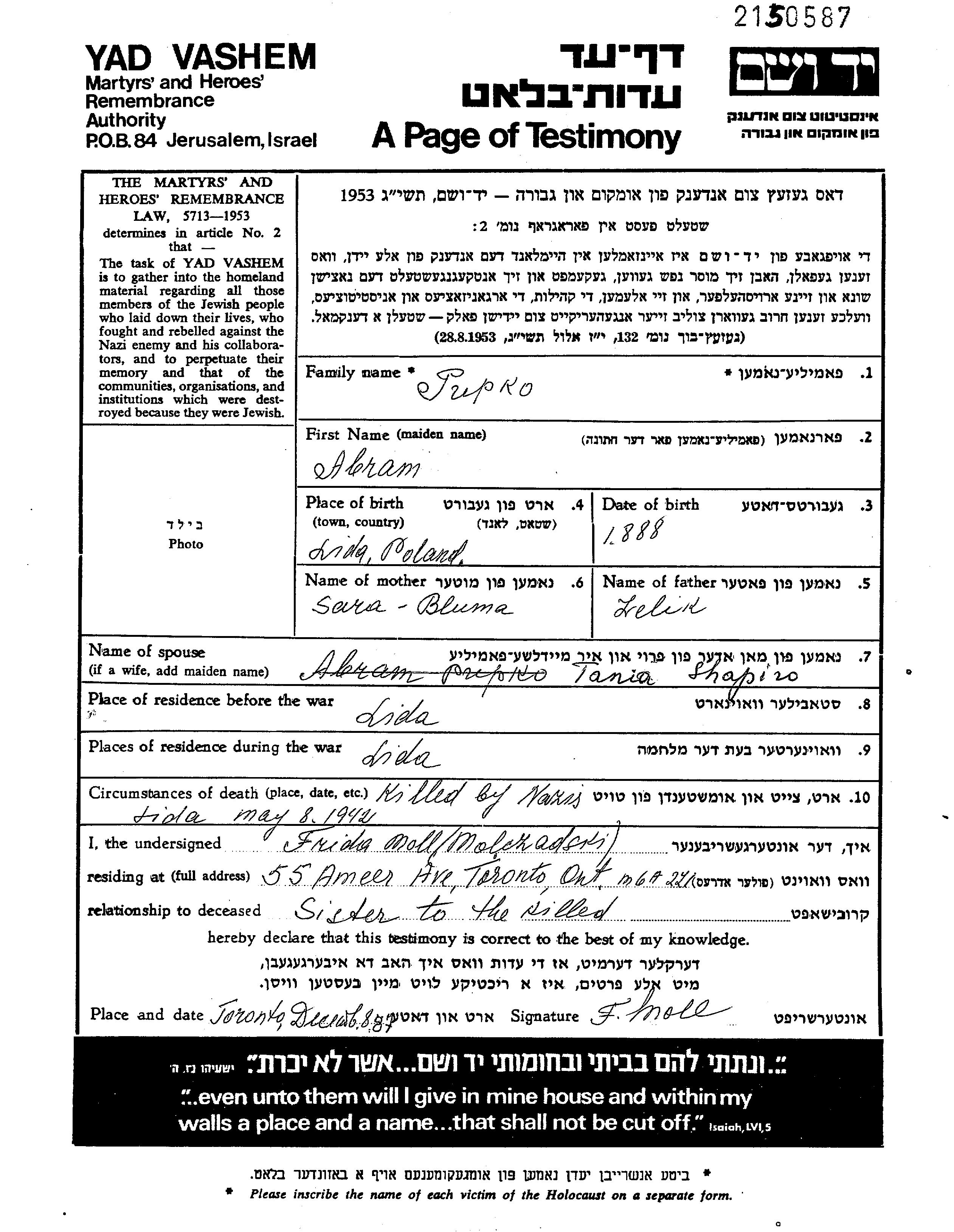 Попко Абрам Лида, Польша Лист свидетельских показаний