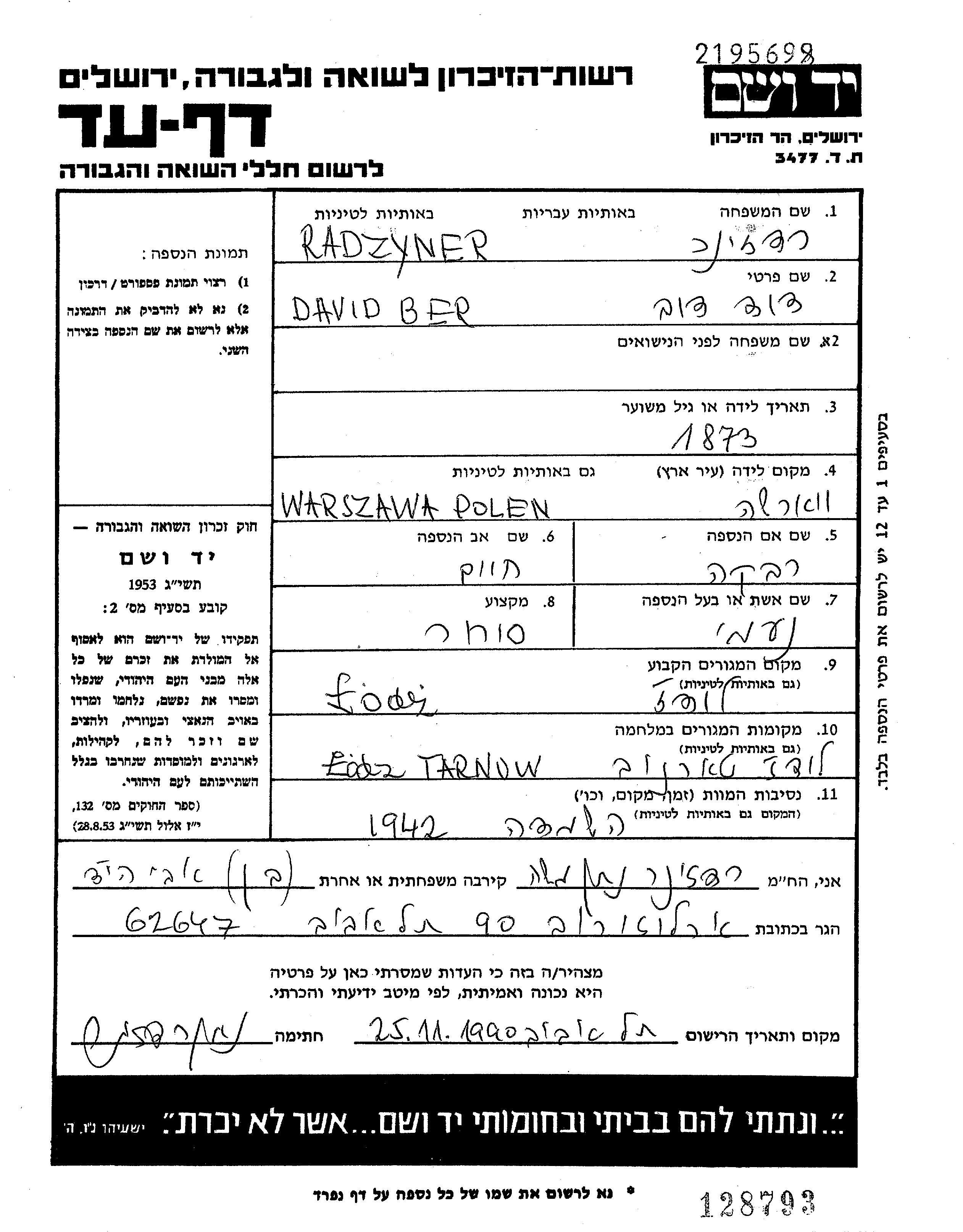 Давид Бер Дов Радзынер, место рождения: Варшава, Польша. Торговец / торговка. Место жительства до войны: Лодзь, Польша.