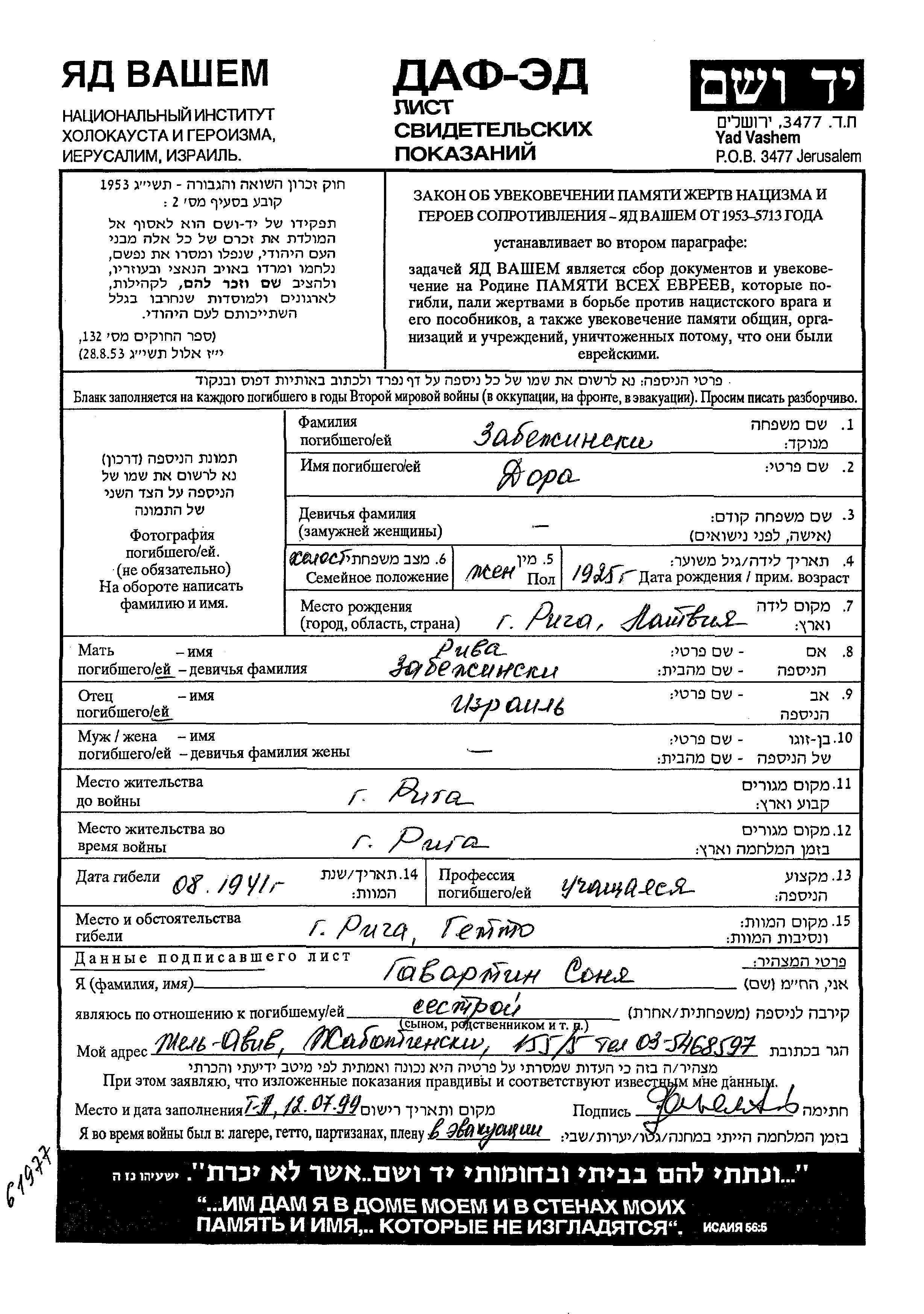 Забежински Дора 1925 Рига, Латвия Лист свидетельских показаний