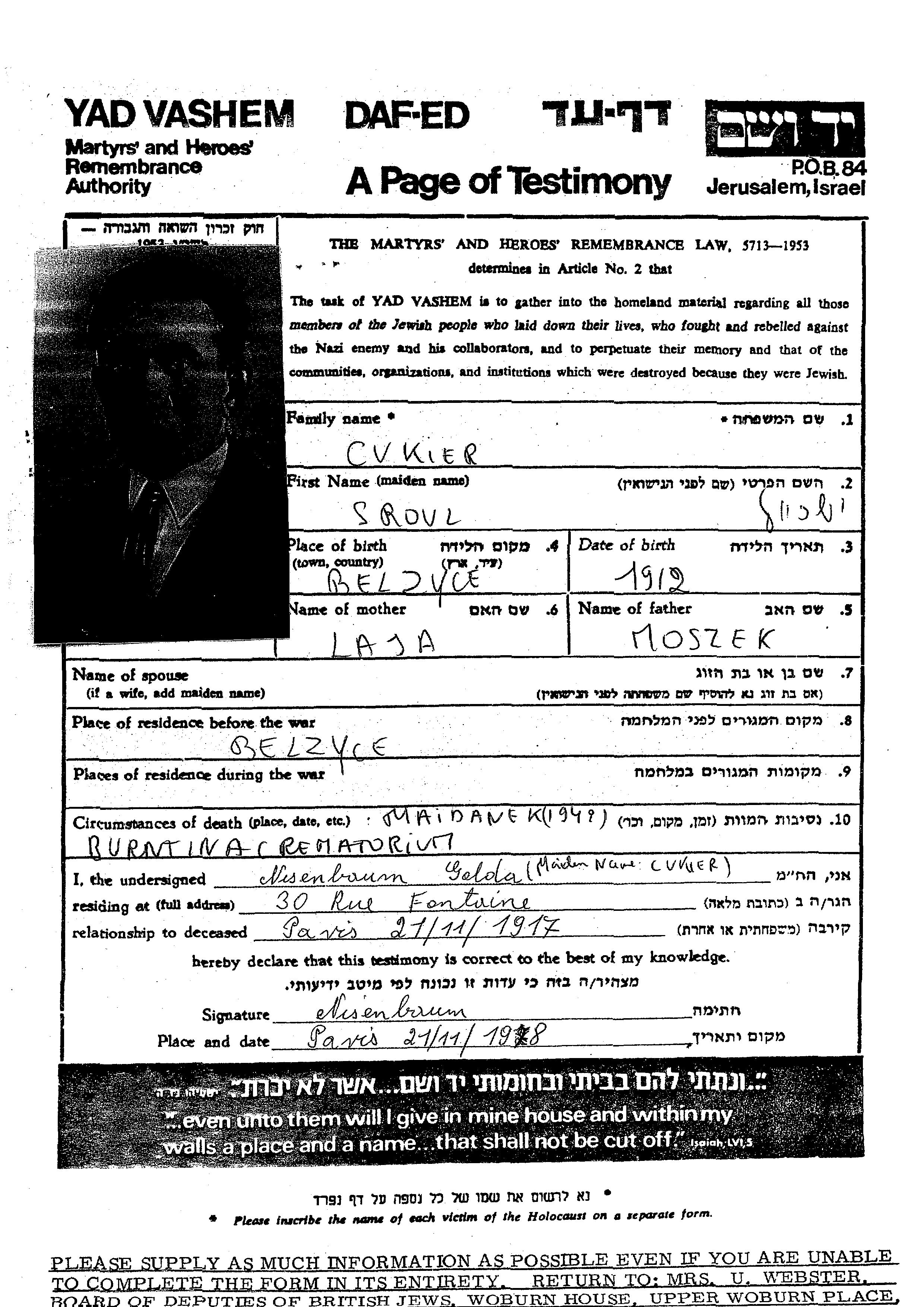 Цукер Сруль 1912 Белжице, Польша Лист свидетельских показаний