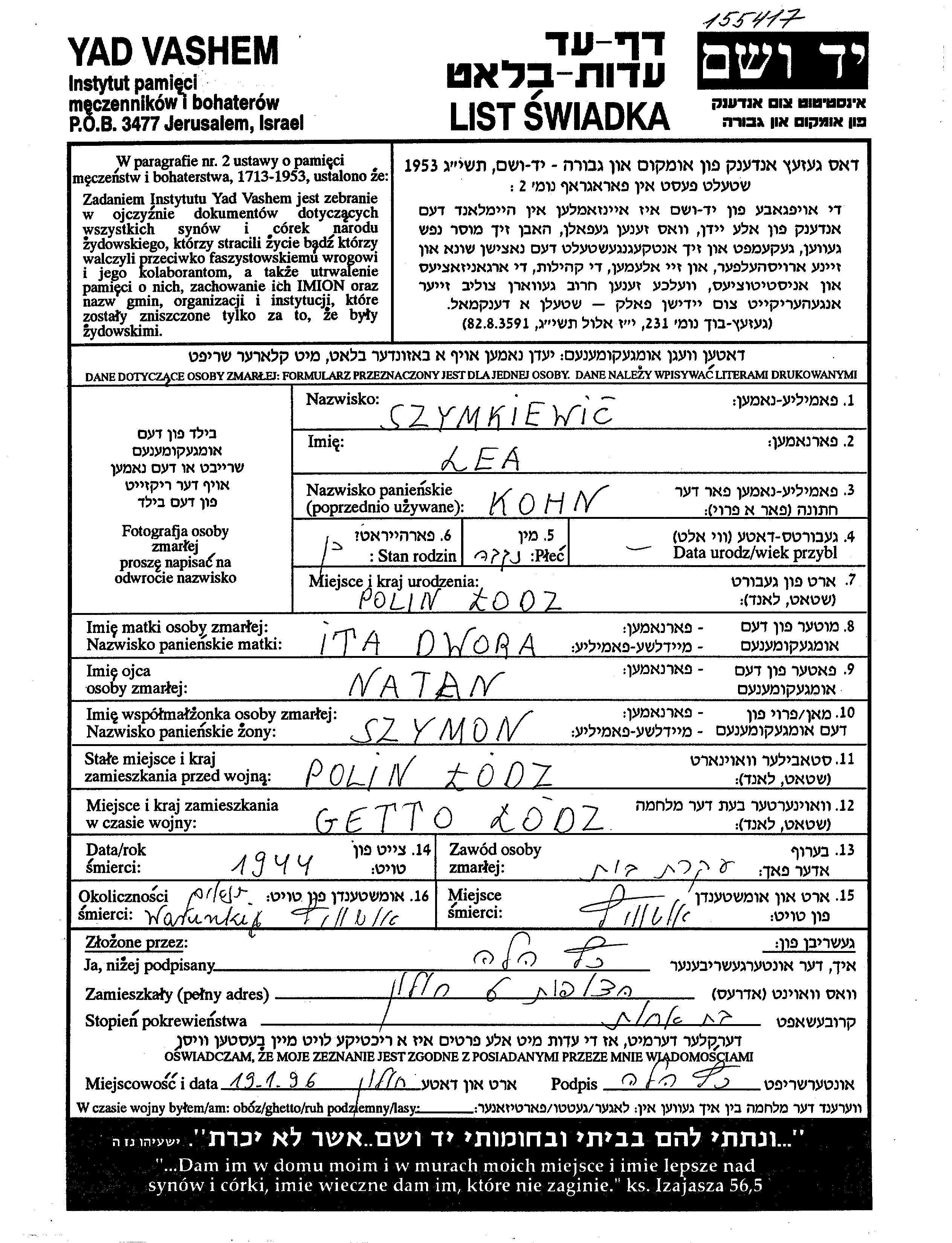 Шимкевиц | Лея | Лодзь, Польша | Лист свидетельских показаний | |