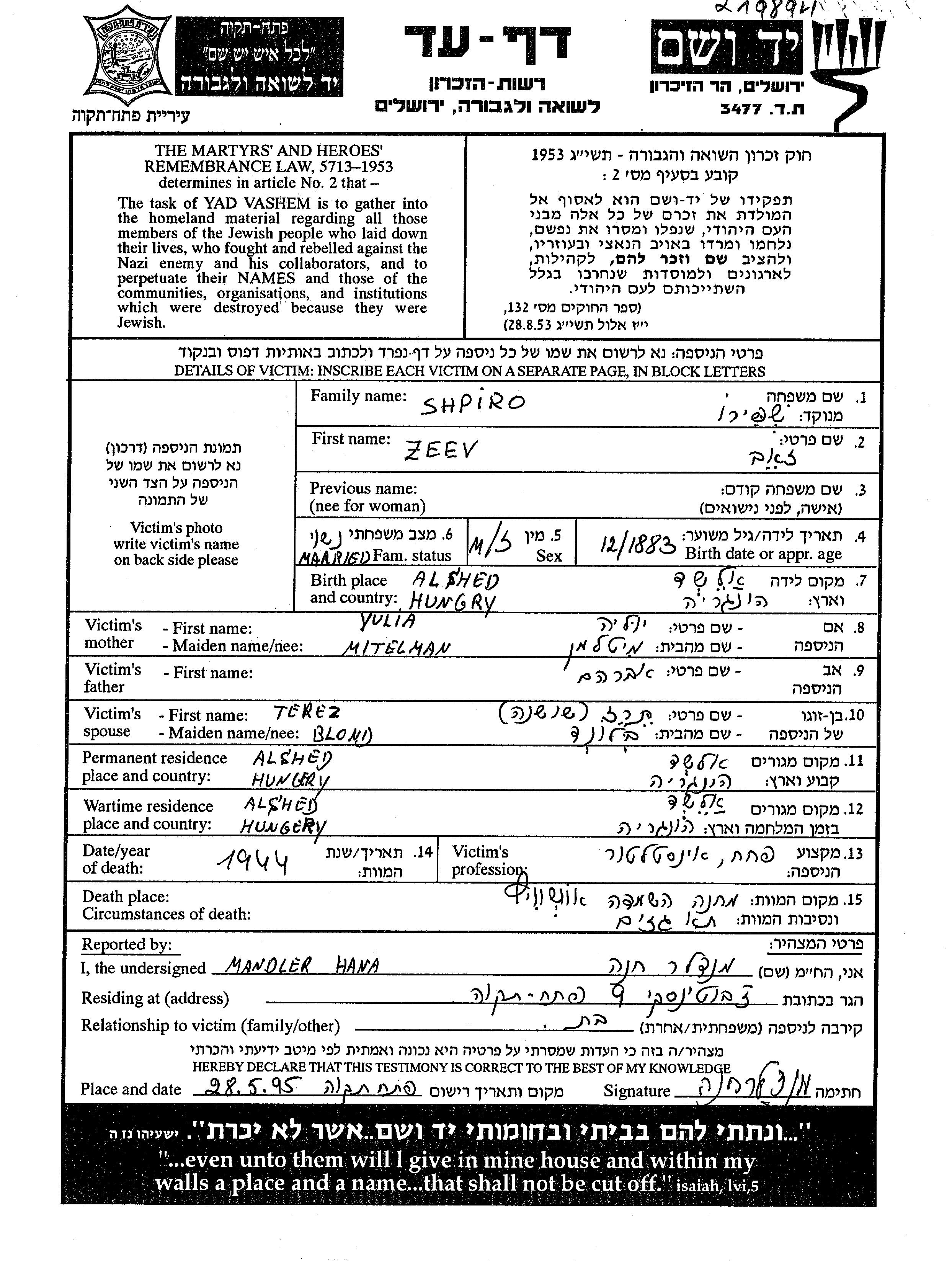 Шапиро | Зеев | Алешд, Румыния | Лист свидетельских показаний |