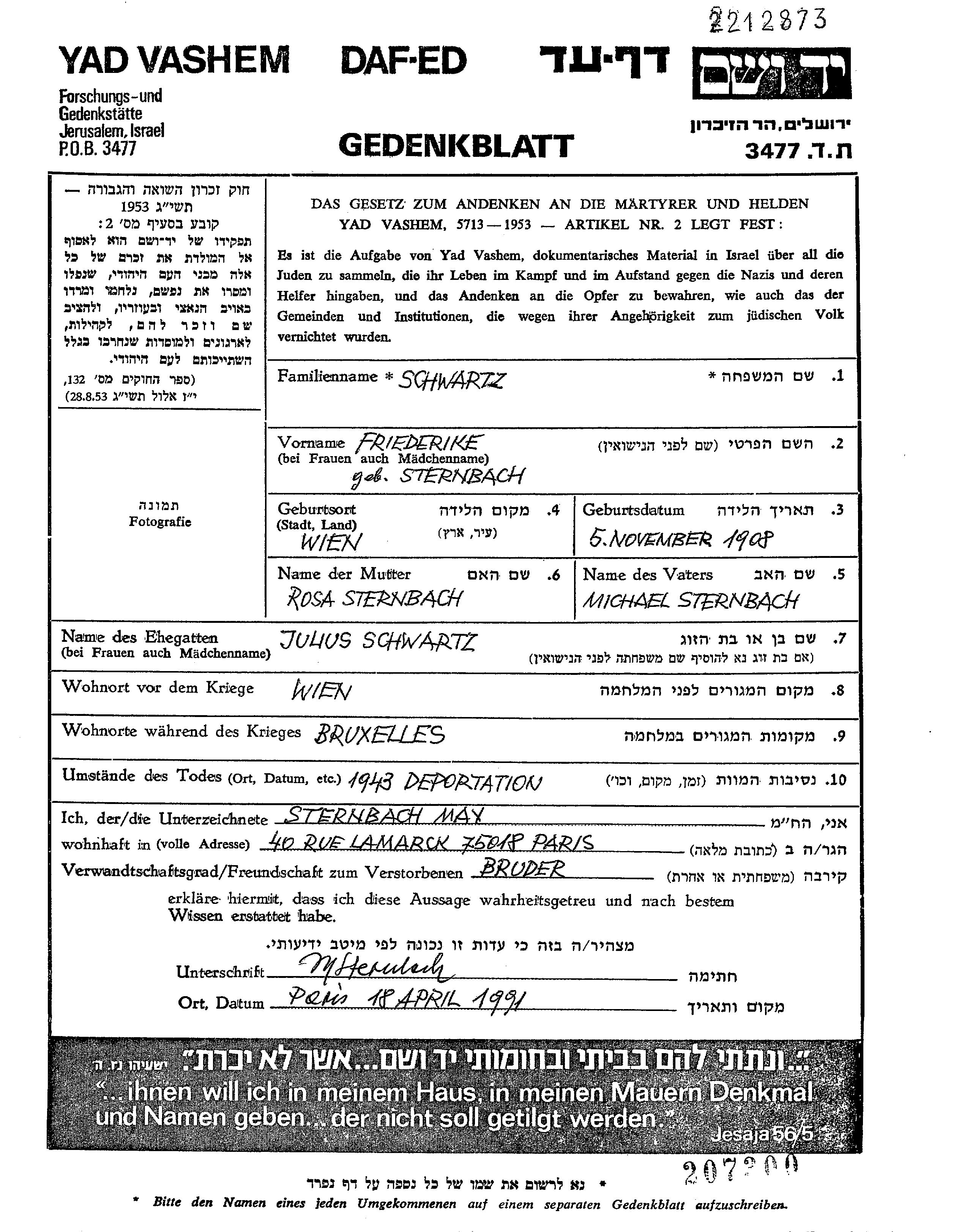 Шварц | Фридерике Фридерик | 1908 | Вена, Австрия | Лист свидетельских показаний |