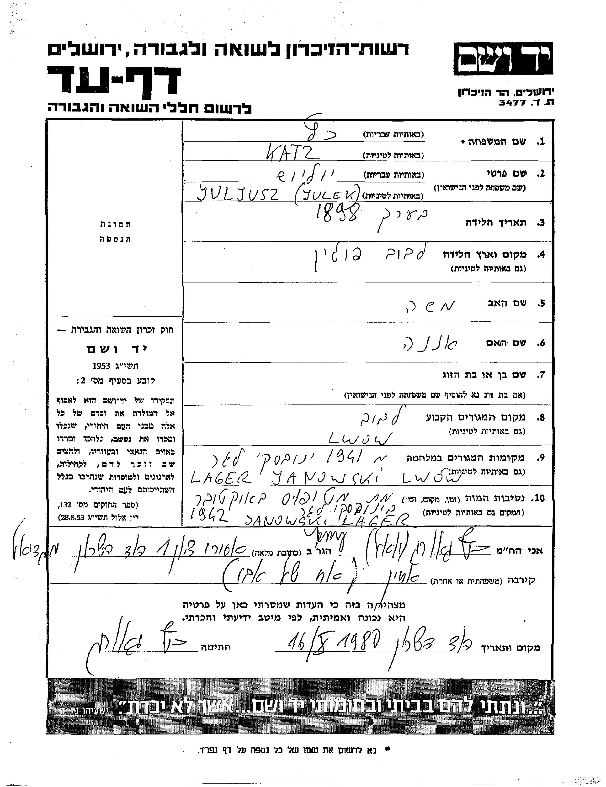 Кац Юлиус 1898 Львов, Польша Лист свидетельских показаний