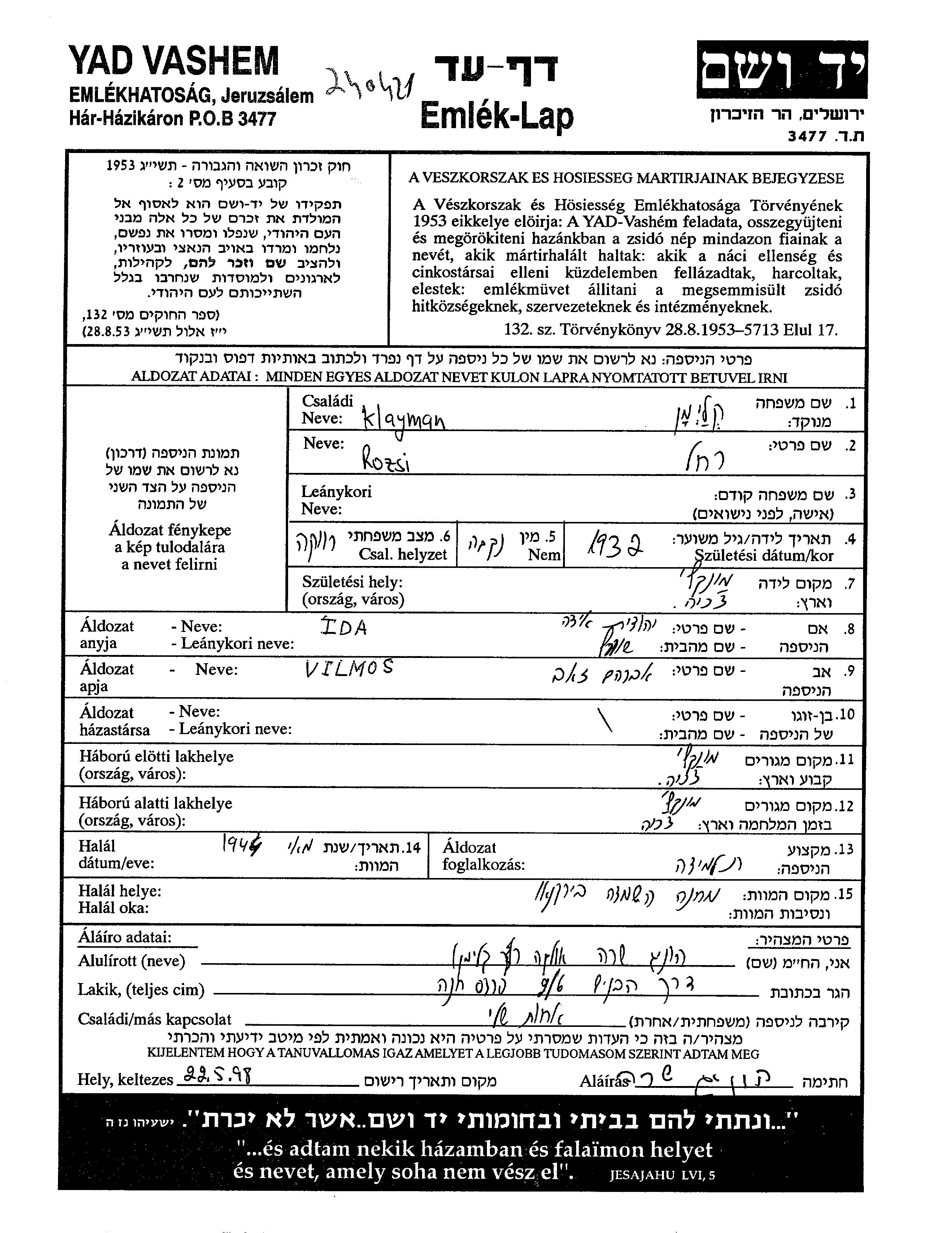 Клайман Рожи Рахель 1932 Мункач, Чехословакия Лист свидетельских показаний