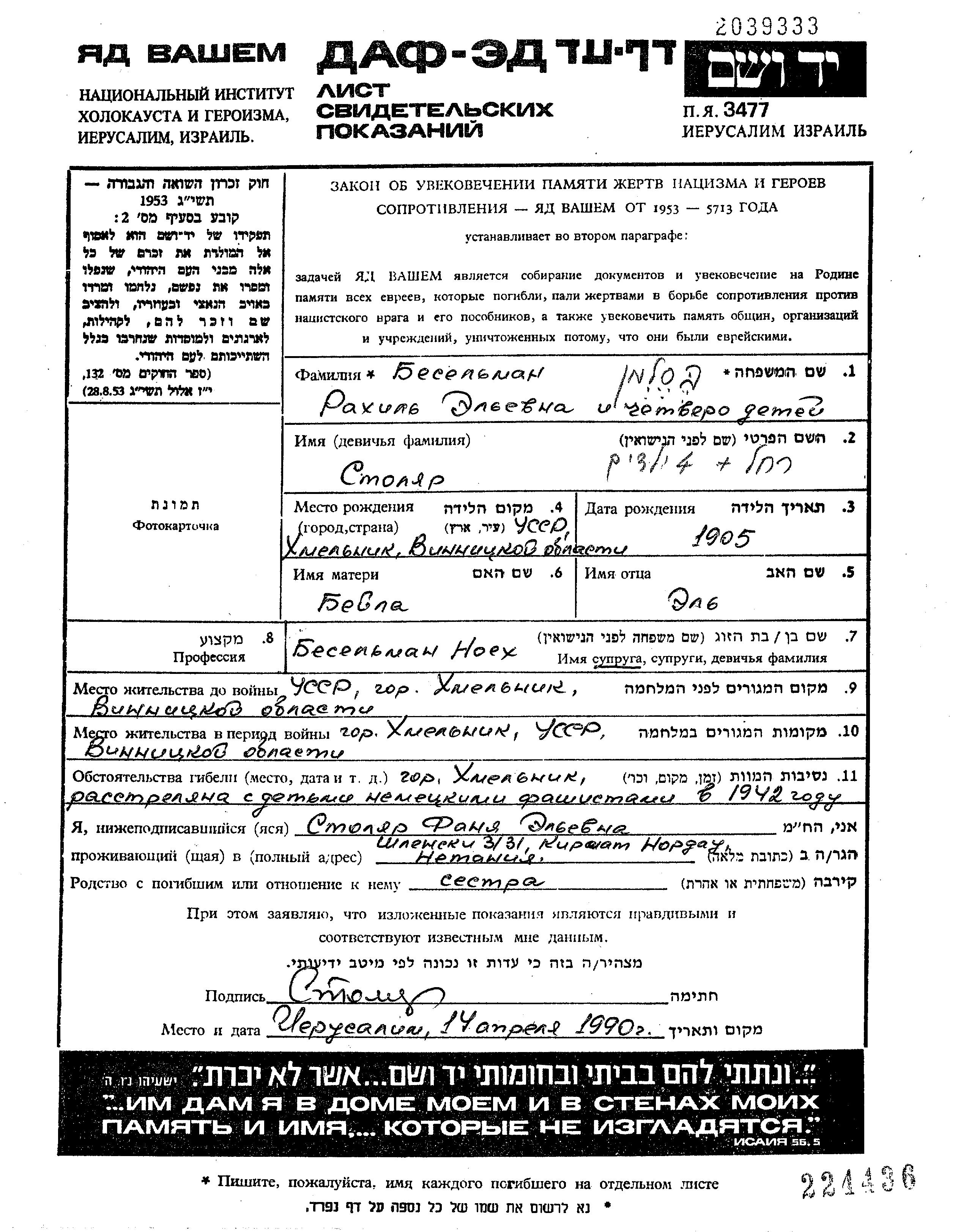 Бесельман Рахиль 1905 Хмельник, Украина (СССР) Лист свидетельских показаний