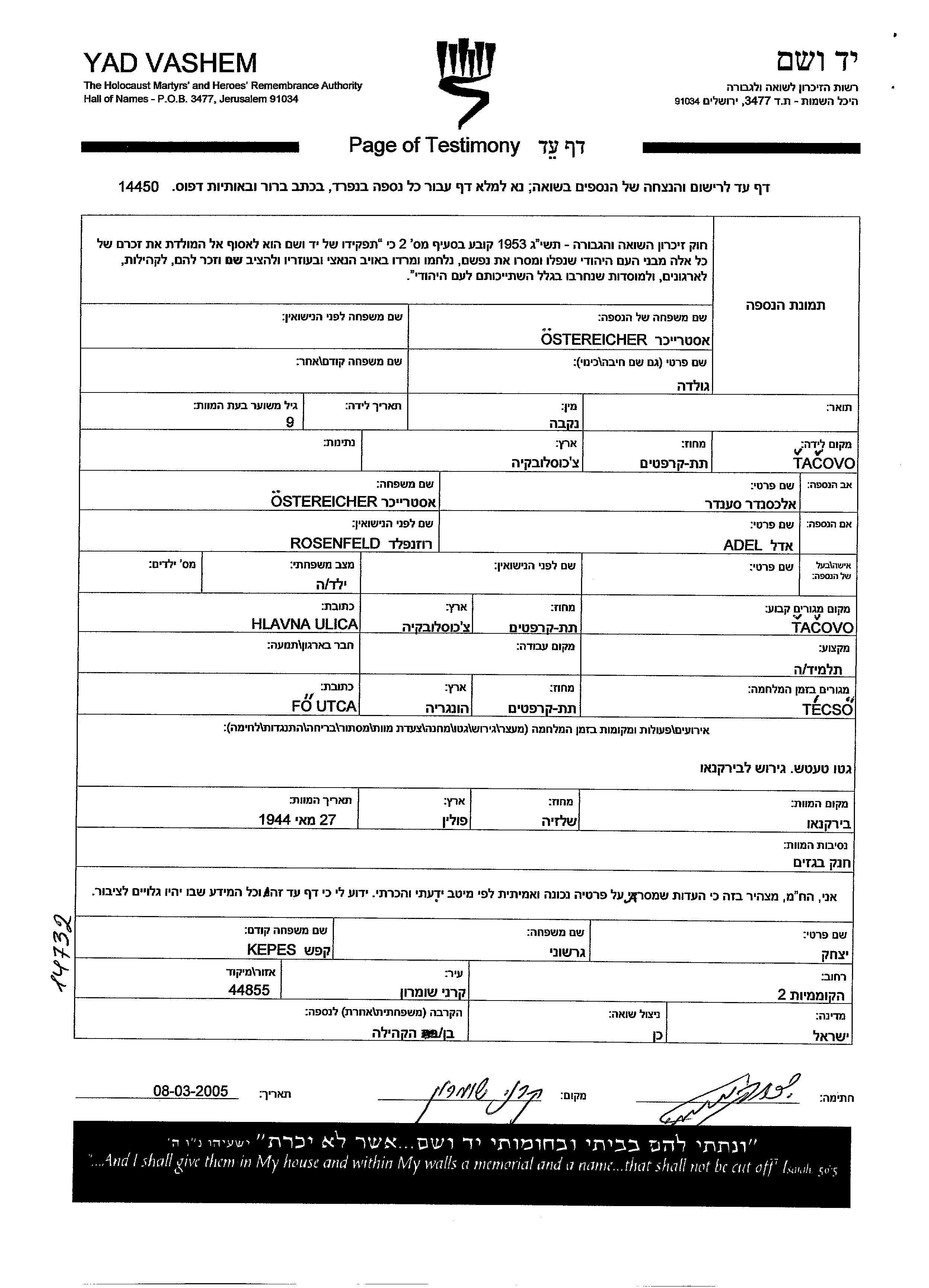 Эстрайхер Голда Тячово, Чехословакия Лист свидетельских показаний