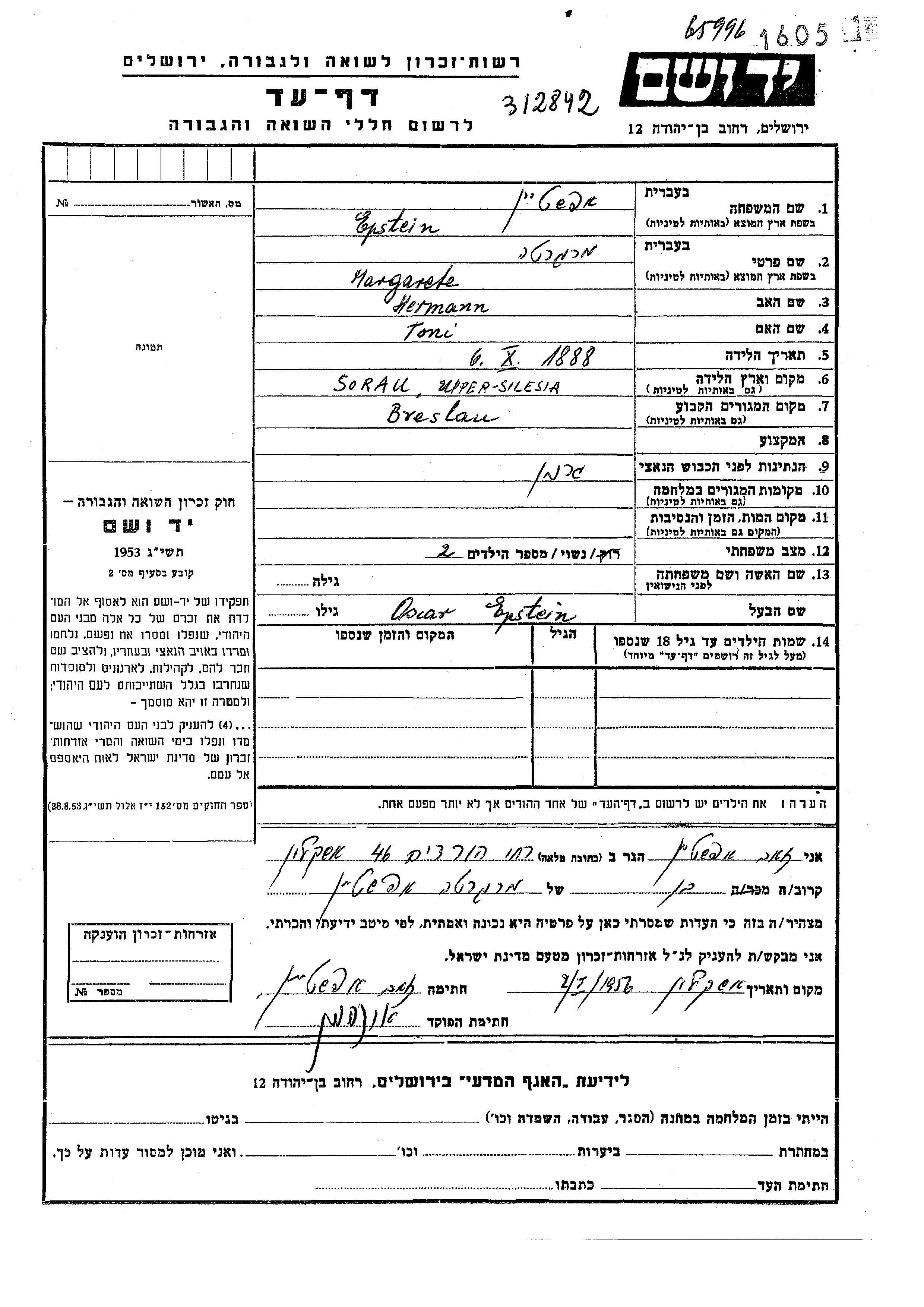 Эпштейн Маргаретте 1888 Бреслау, Германия Лист свидетельских показаний