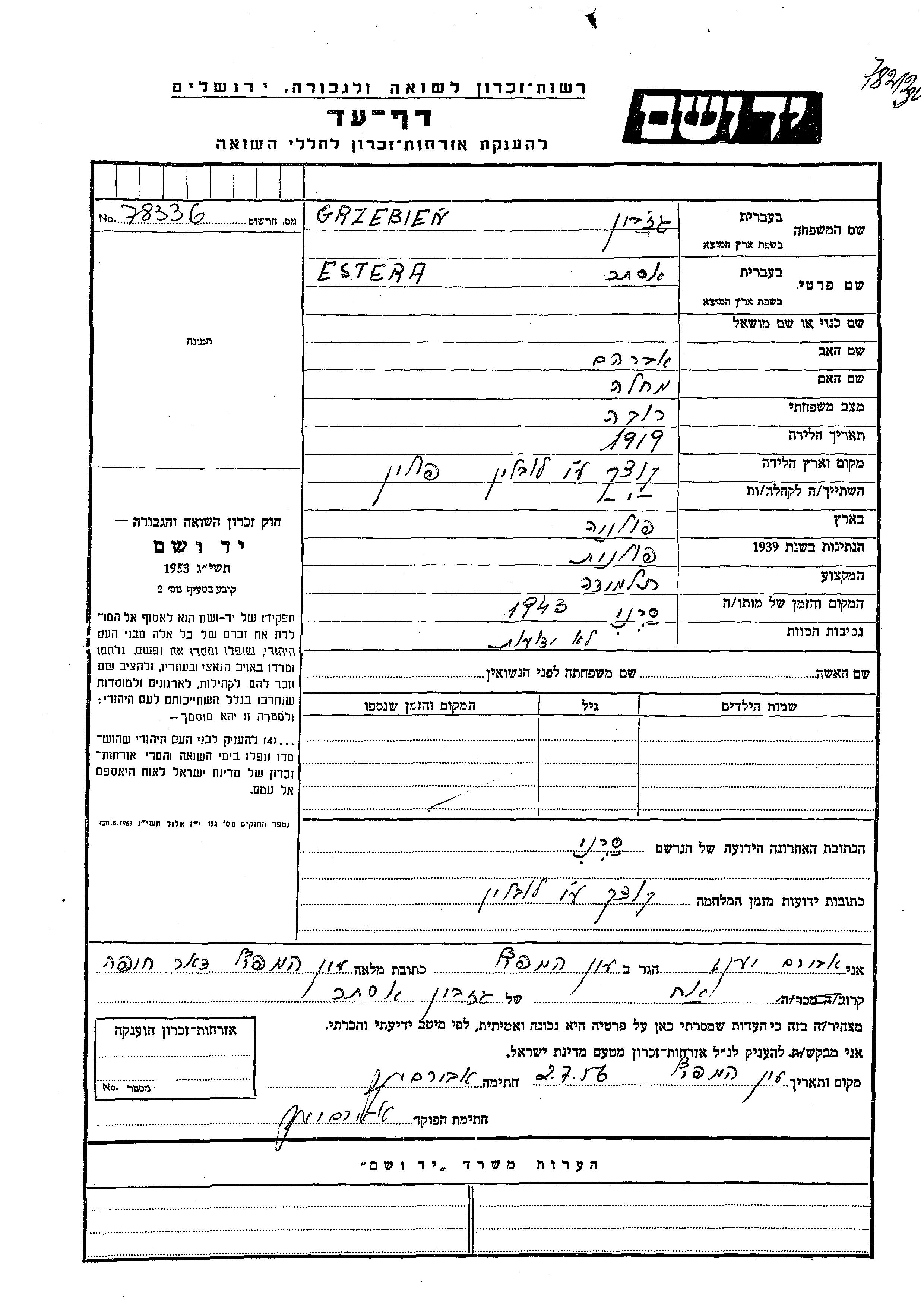 Гжебин | Яков | 1924 | Коцк, Польша | Анкета для переживших Шоа, эвакуированных и беженцев |