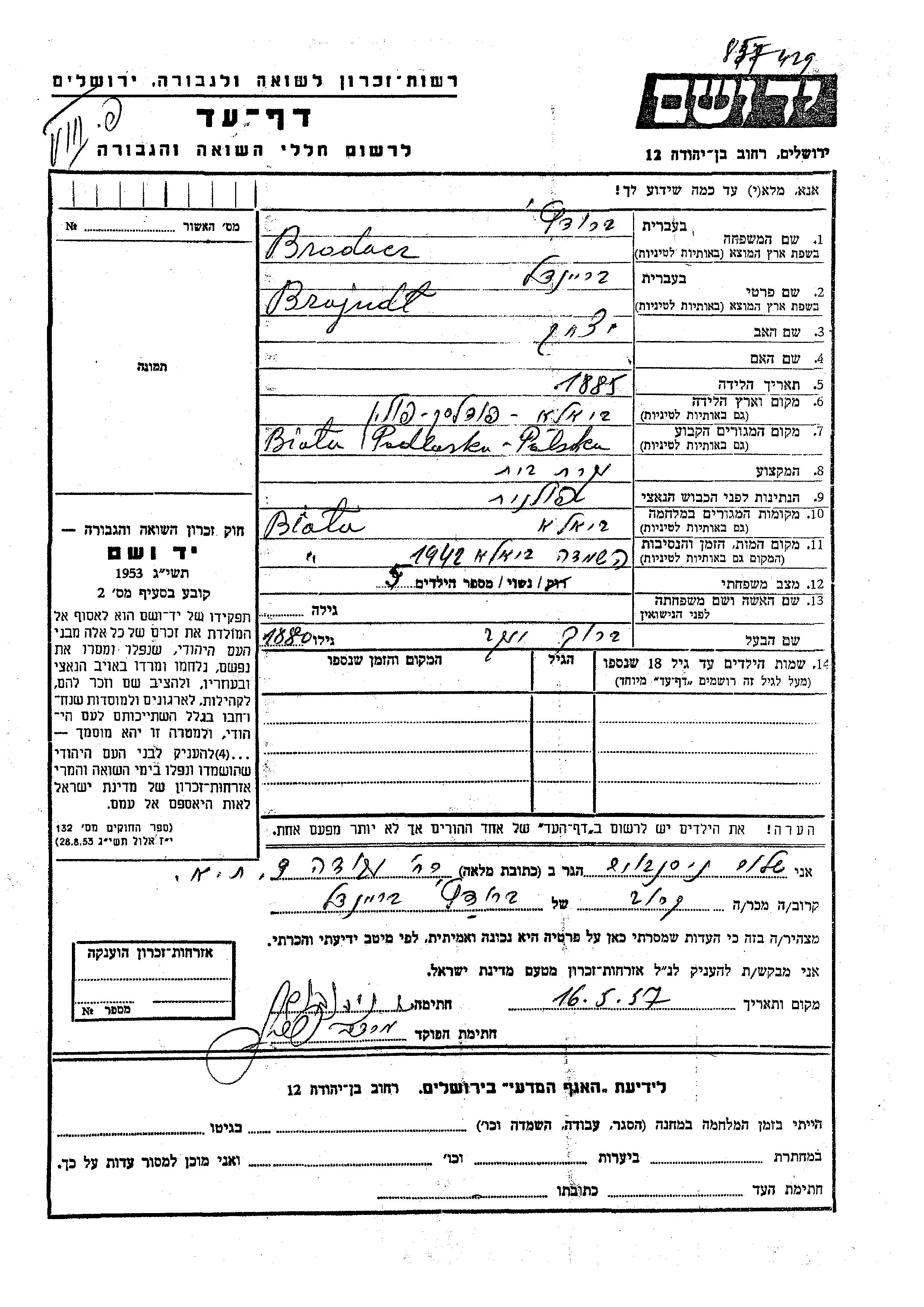 Брейндл Бродач, место рождения: Бяла-Подляска, Польша. Отец: Ицхак. Домохозяйка. Женат / замужем. Место жительства до войны: Бяла-Подляска, Польша. Место во время войны: Бяла-Подляска, Польша.