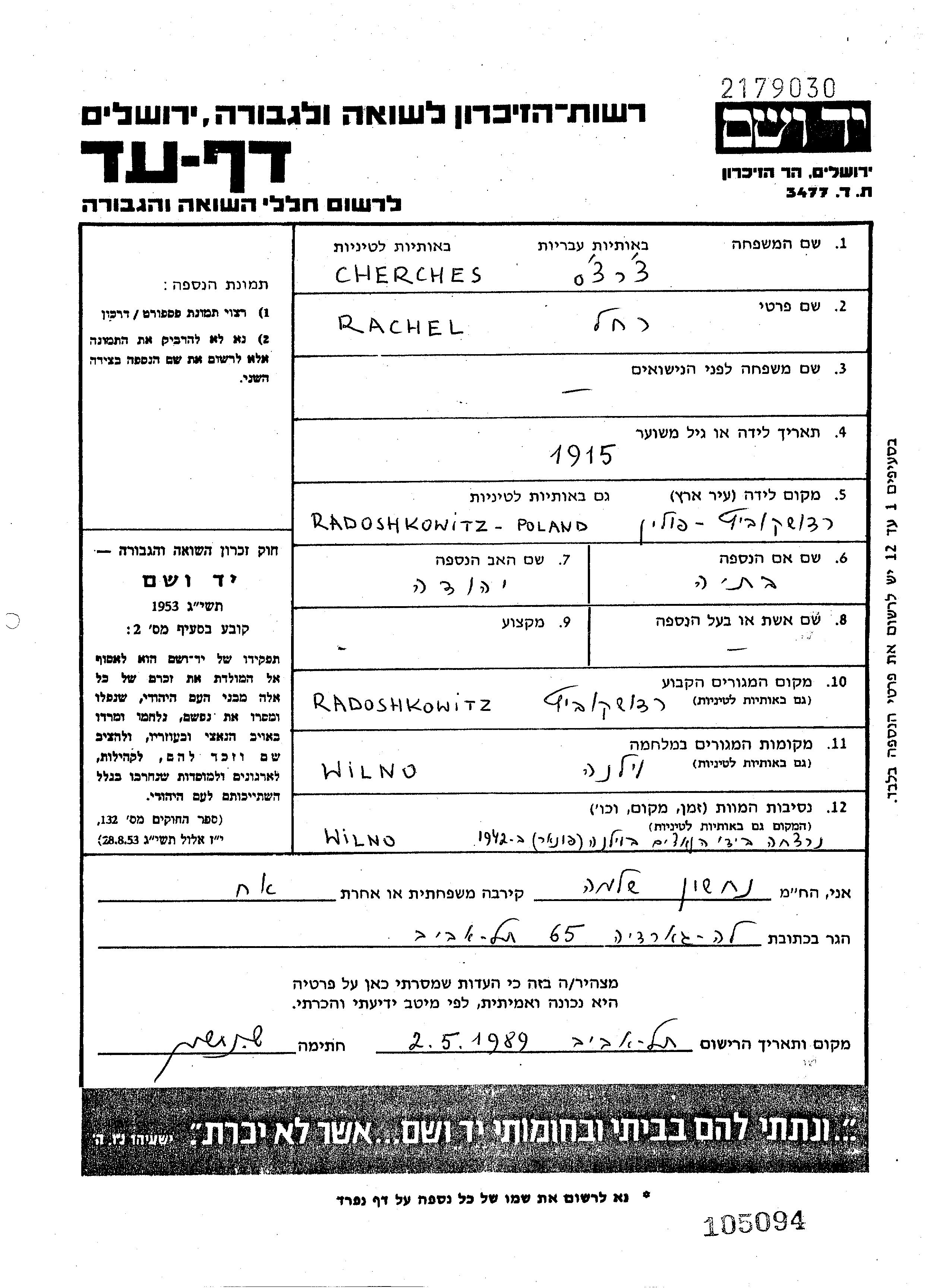 Черчес Рахель 1915 Радошковичи, Польша Лист свидетельских показаний