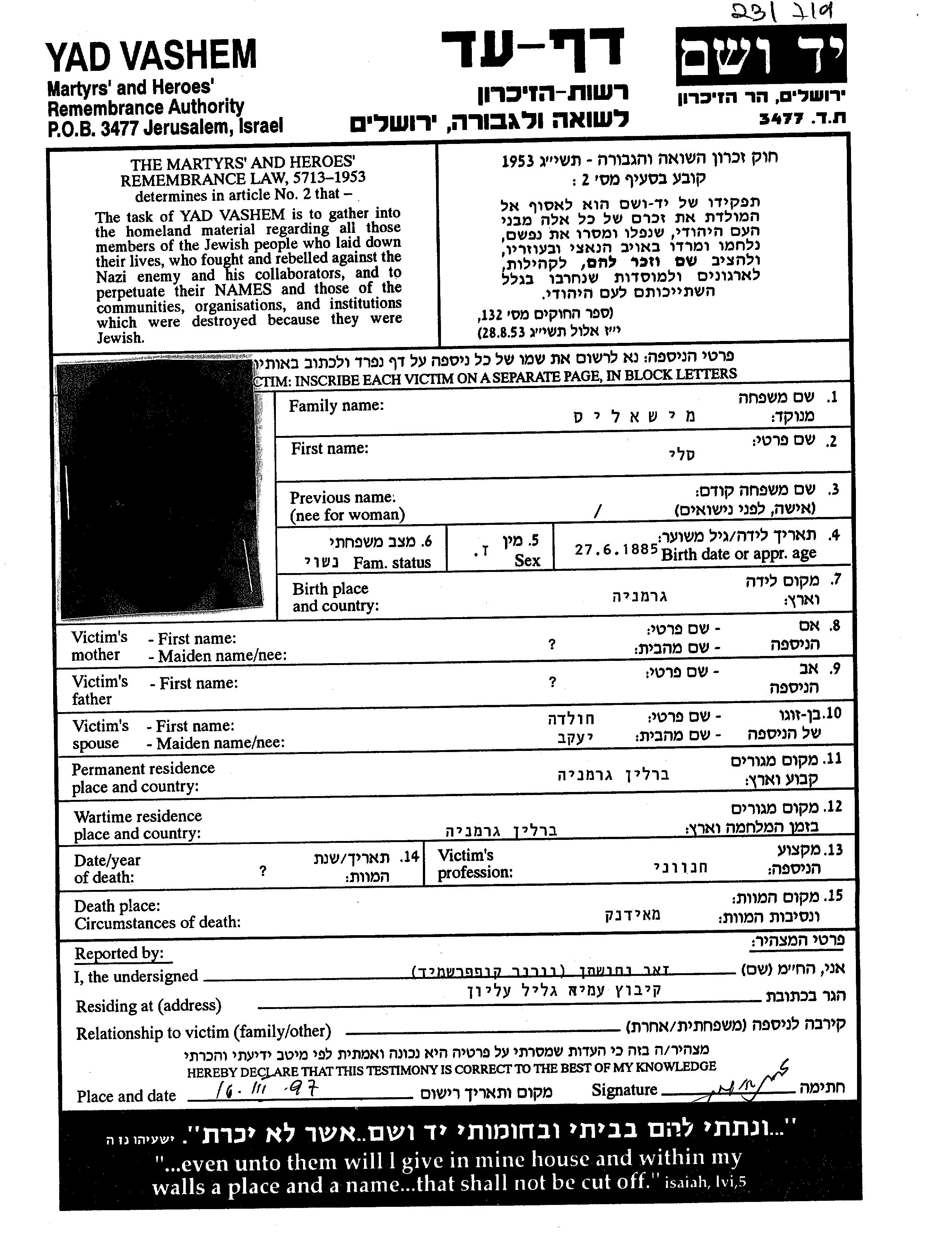 Михаэлис Салли Сали 1885 Берлин, Германия Лист свидетельских показаний