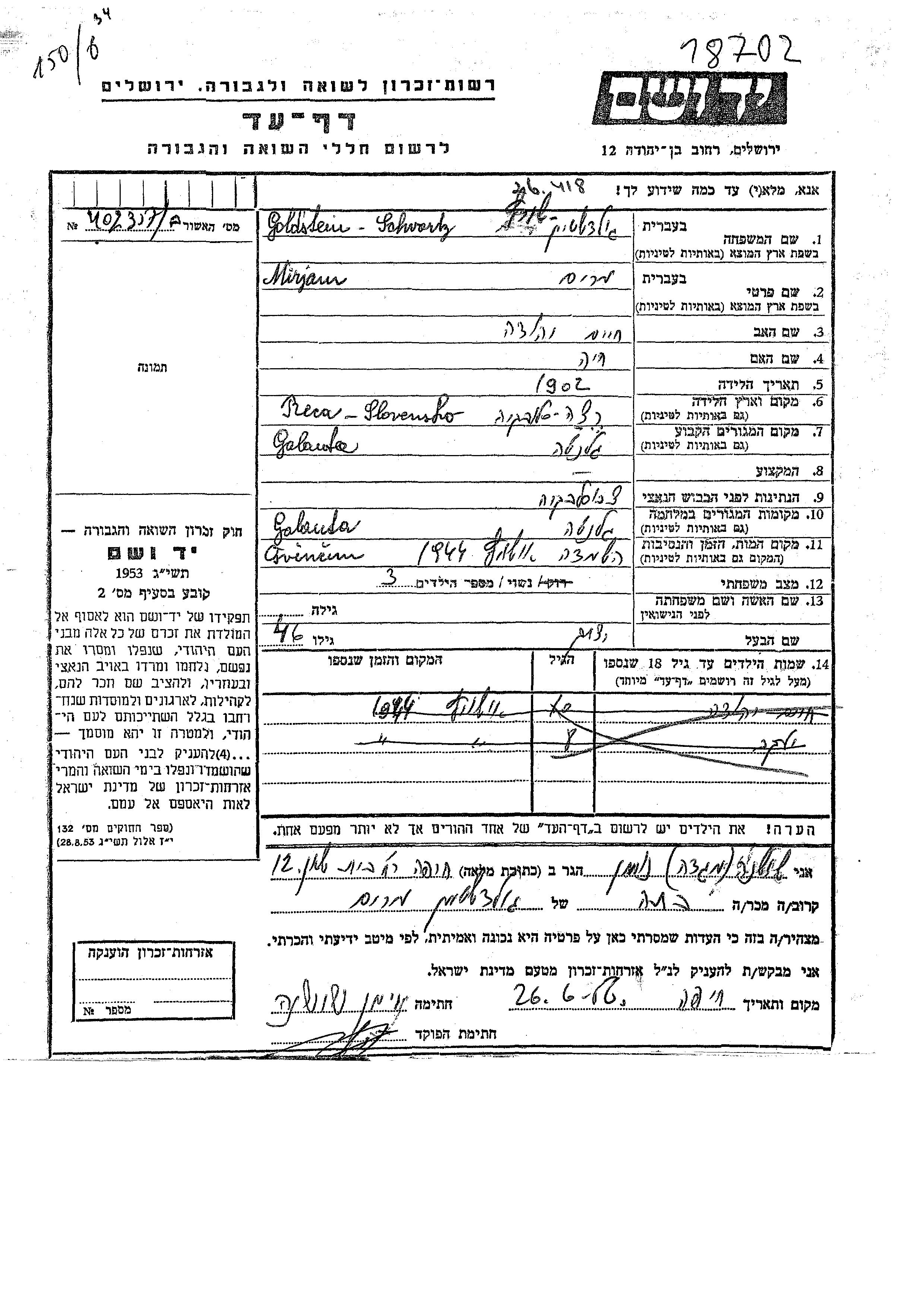 Гольдштейн Шварц Мирьям 1902 Галанта, Чехословакия Лист свидетельских показаний