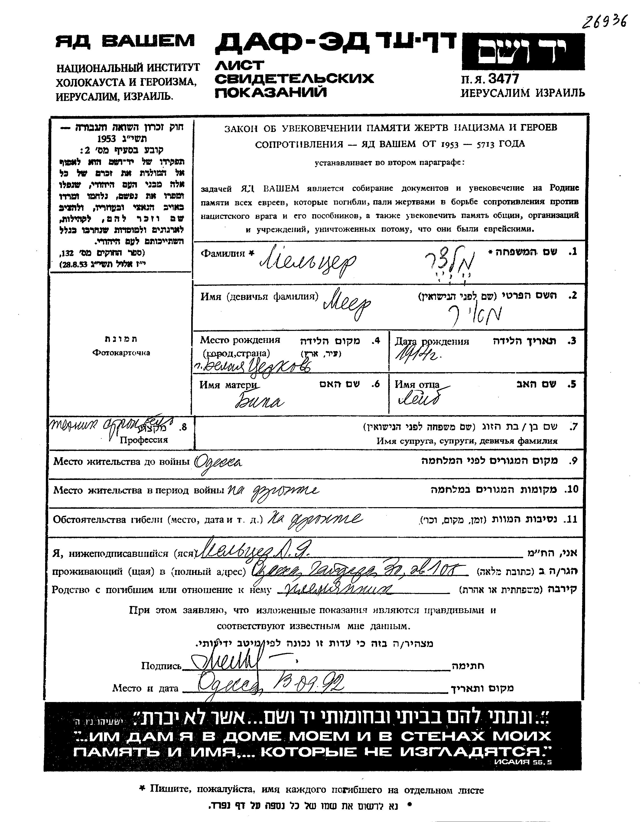 Мельцер | Мейер | 1914 | Одесса, Украина (СССР) | Лист свидетельских показаний |