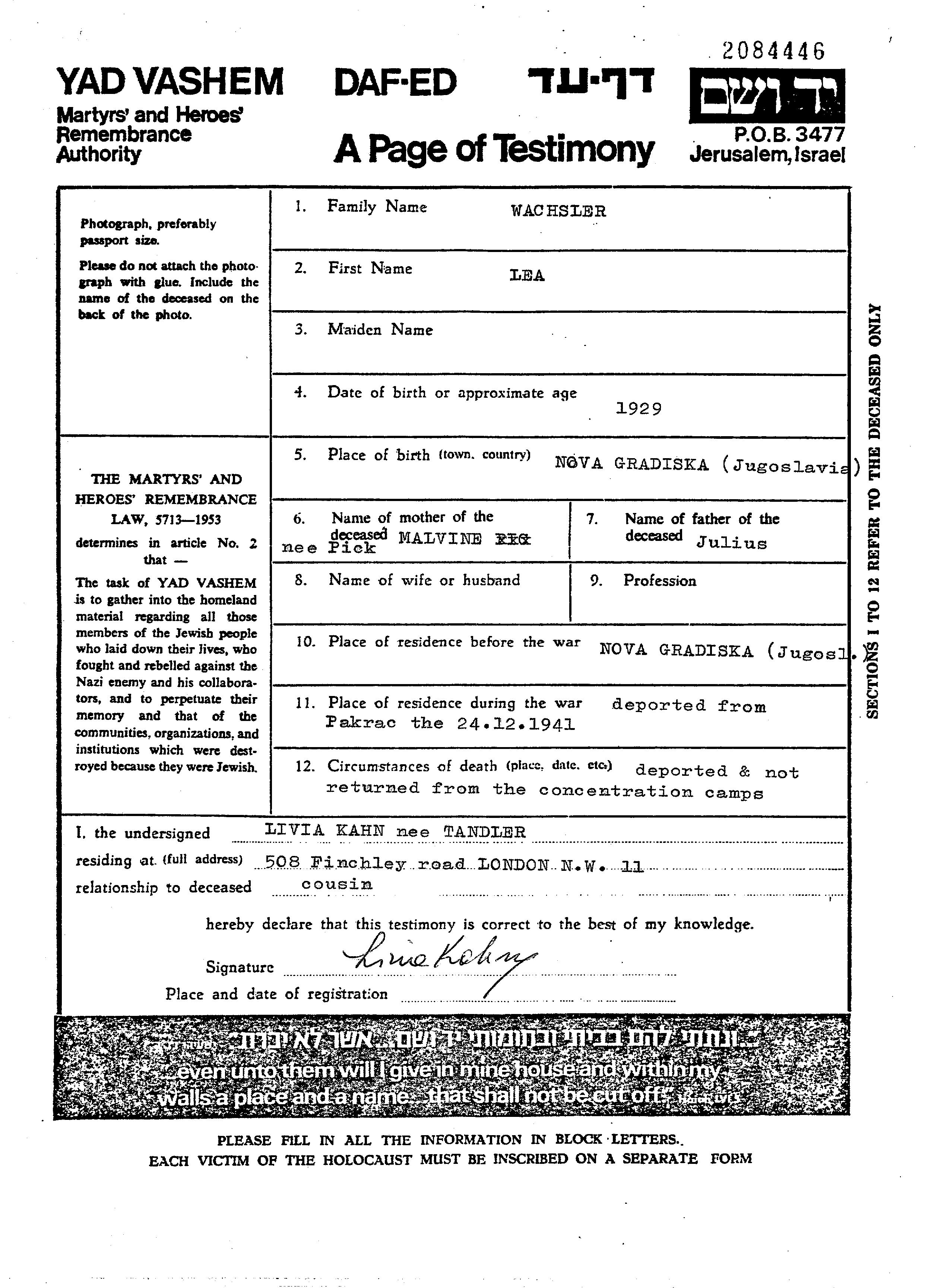 | Вакслер | Лея | 1929 | Нова-Градишка, Югославия | Лист свидетельских показаний |