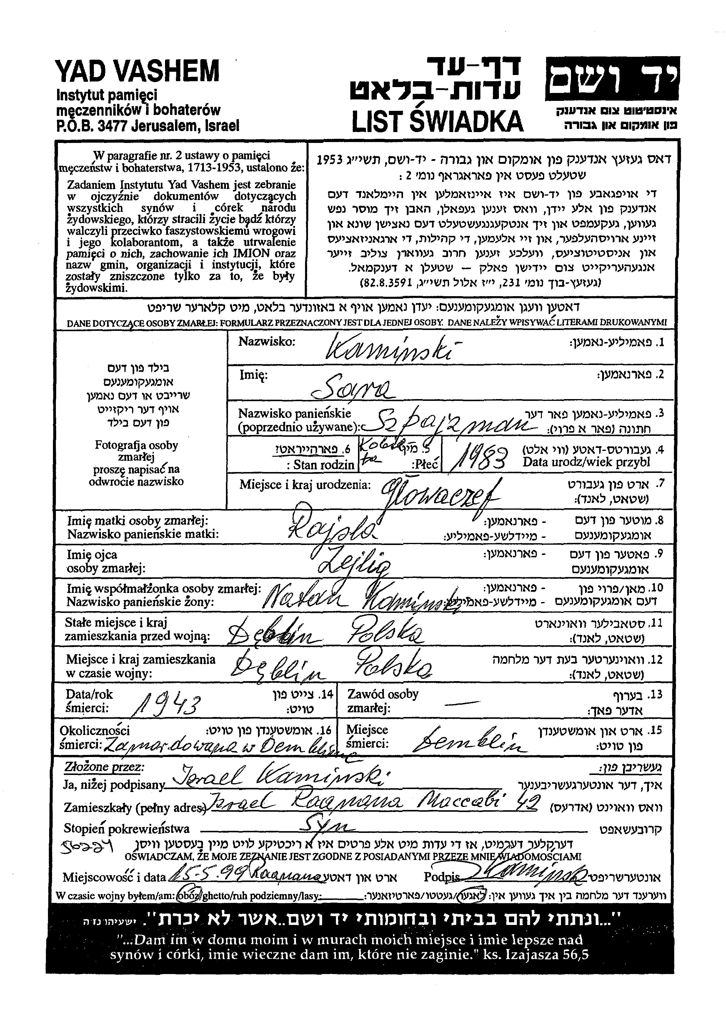 Сара Камински, девичья фамилия Шпайзман, место рождения: Гловачув, Польша. Место жительства до войны: Демблин, Польша.