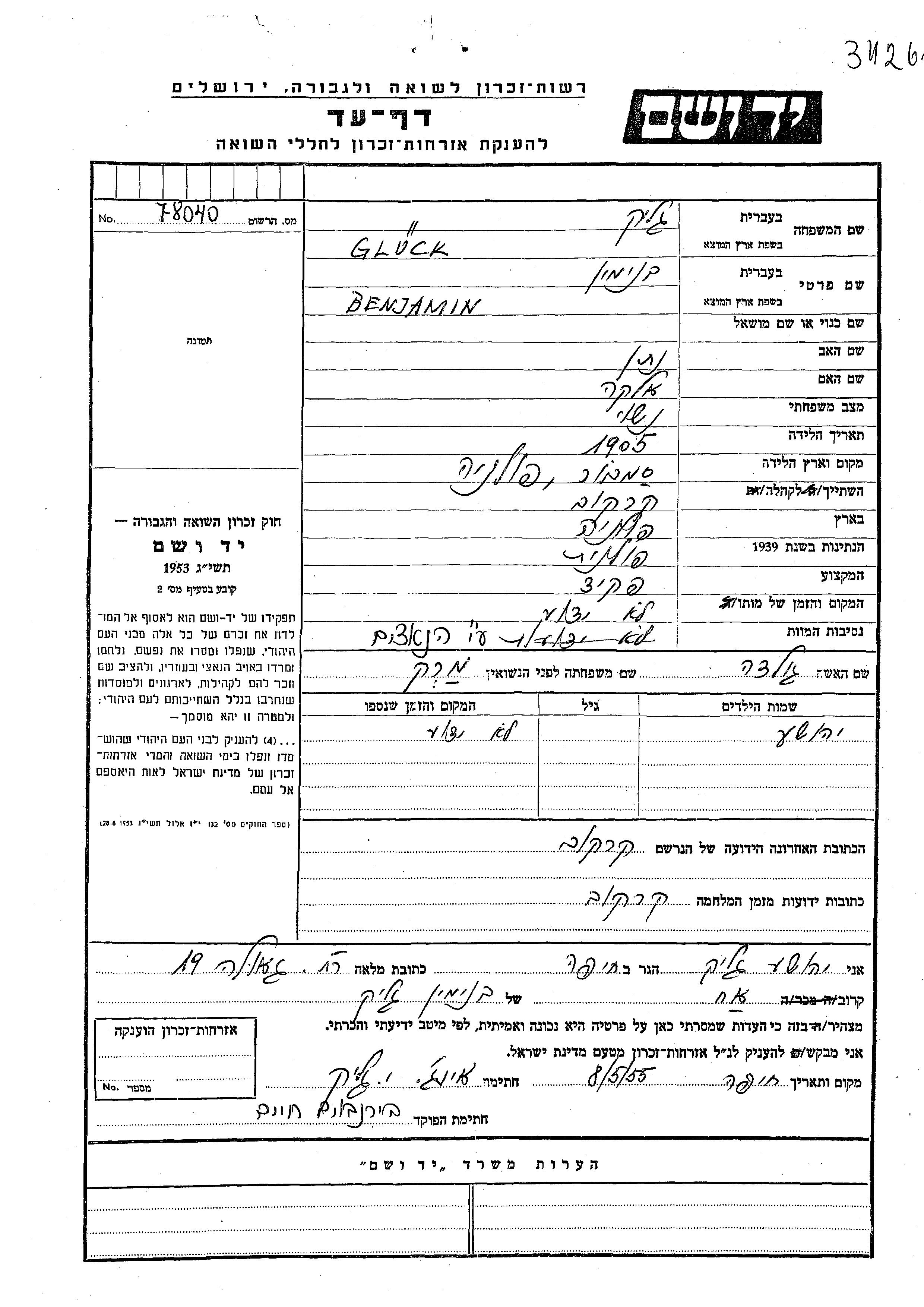 Глюк | Беньямин | 1905 | Краков, Польша | Лист свидетельских показаний |