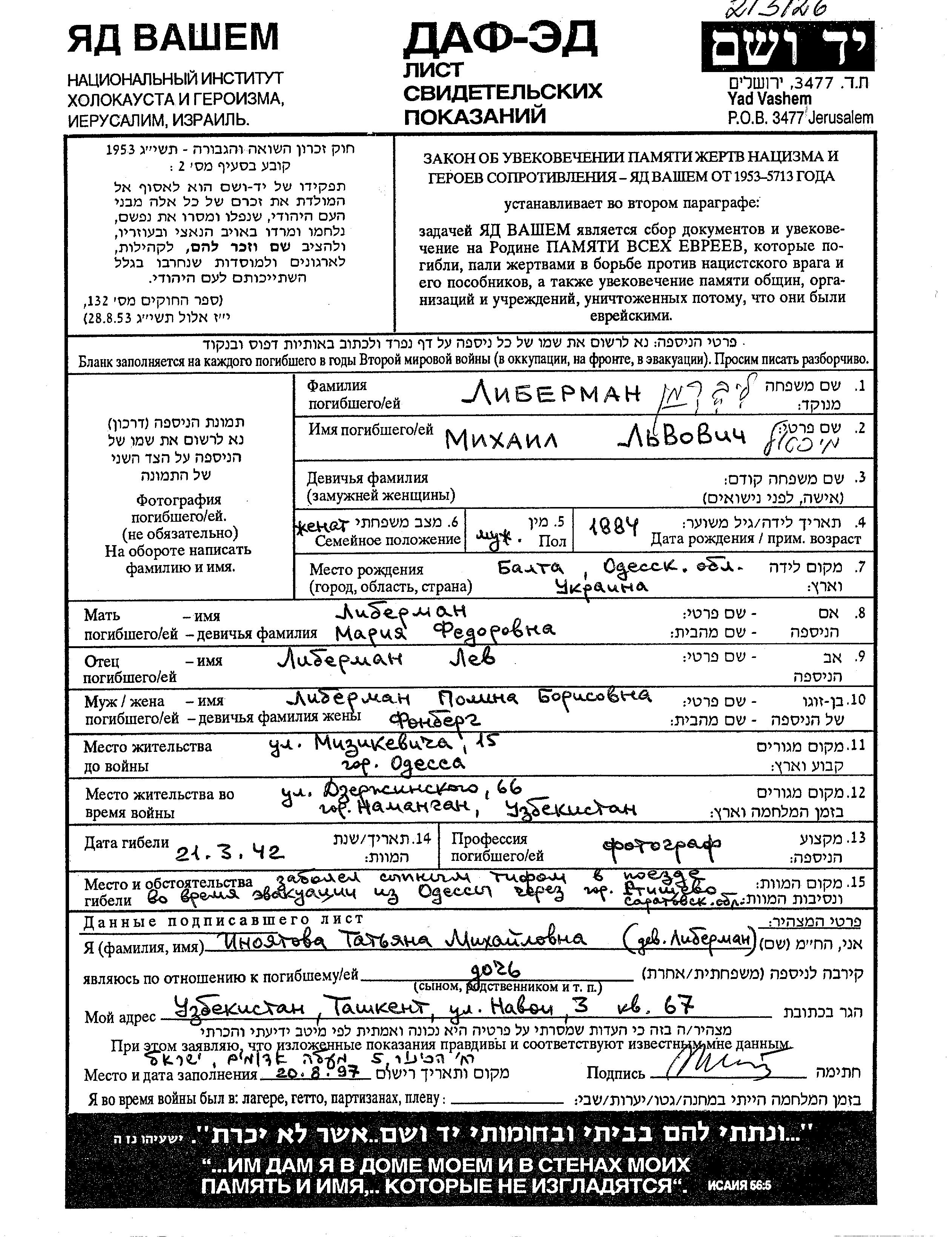 Михаэль Либерман, место рождения: Балта, Украина (СССР). Фотограф. Место жительства до войны: Одесса, Украина (СССР). Михаэль погиб/ла в период 1933-1945 годов в результате опосредованного воздействия Шоа. место смерти: место не указано в 21/03/1942.