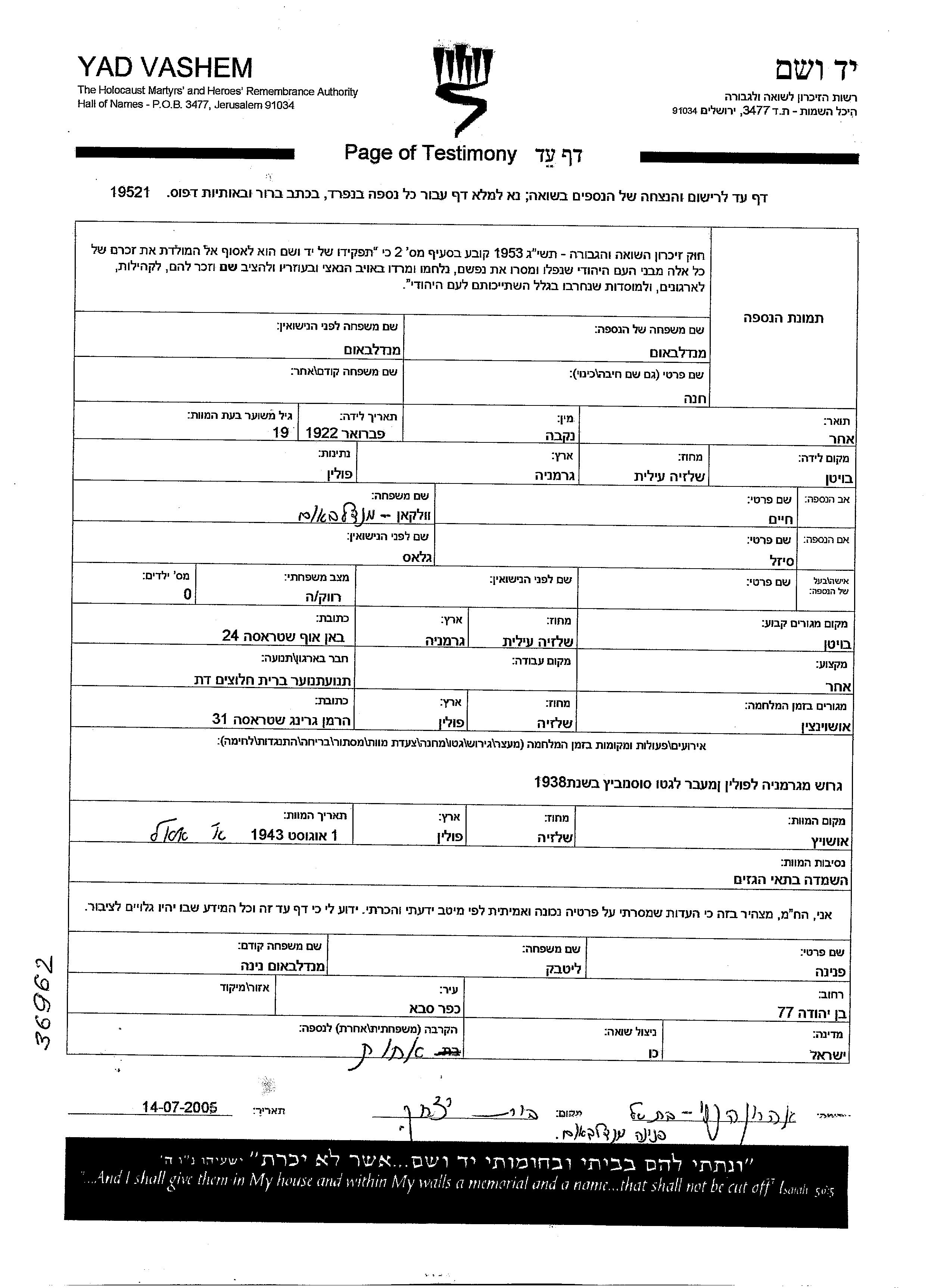 Мандельбаум Хана 1922 Бёйтен, Германия Лист свидетельских показаний (электронный)