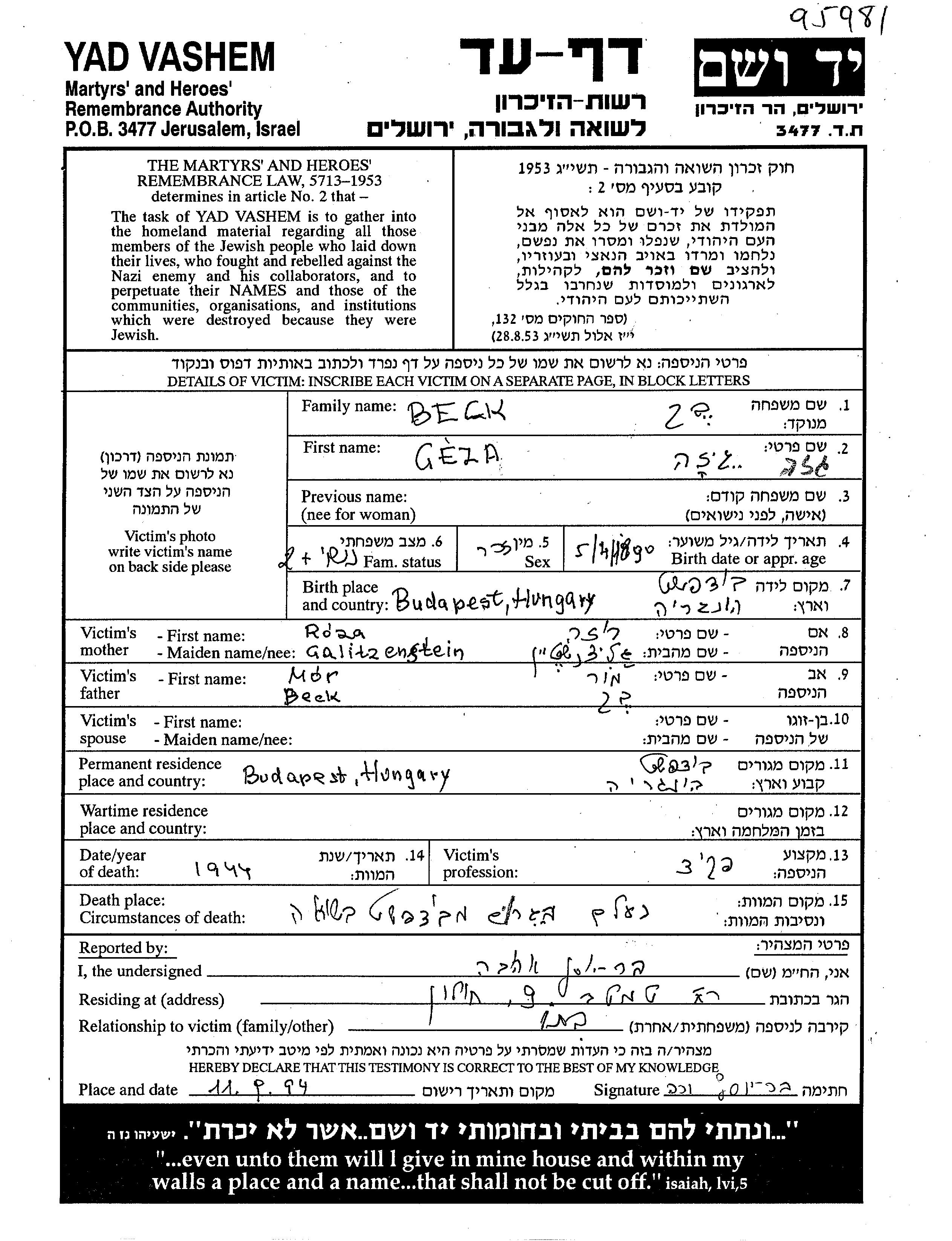 Бек | Геза | 1890 | Будапешт, Венгрия | Список уничтоженных евреев из Венгрии |