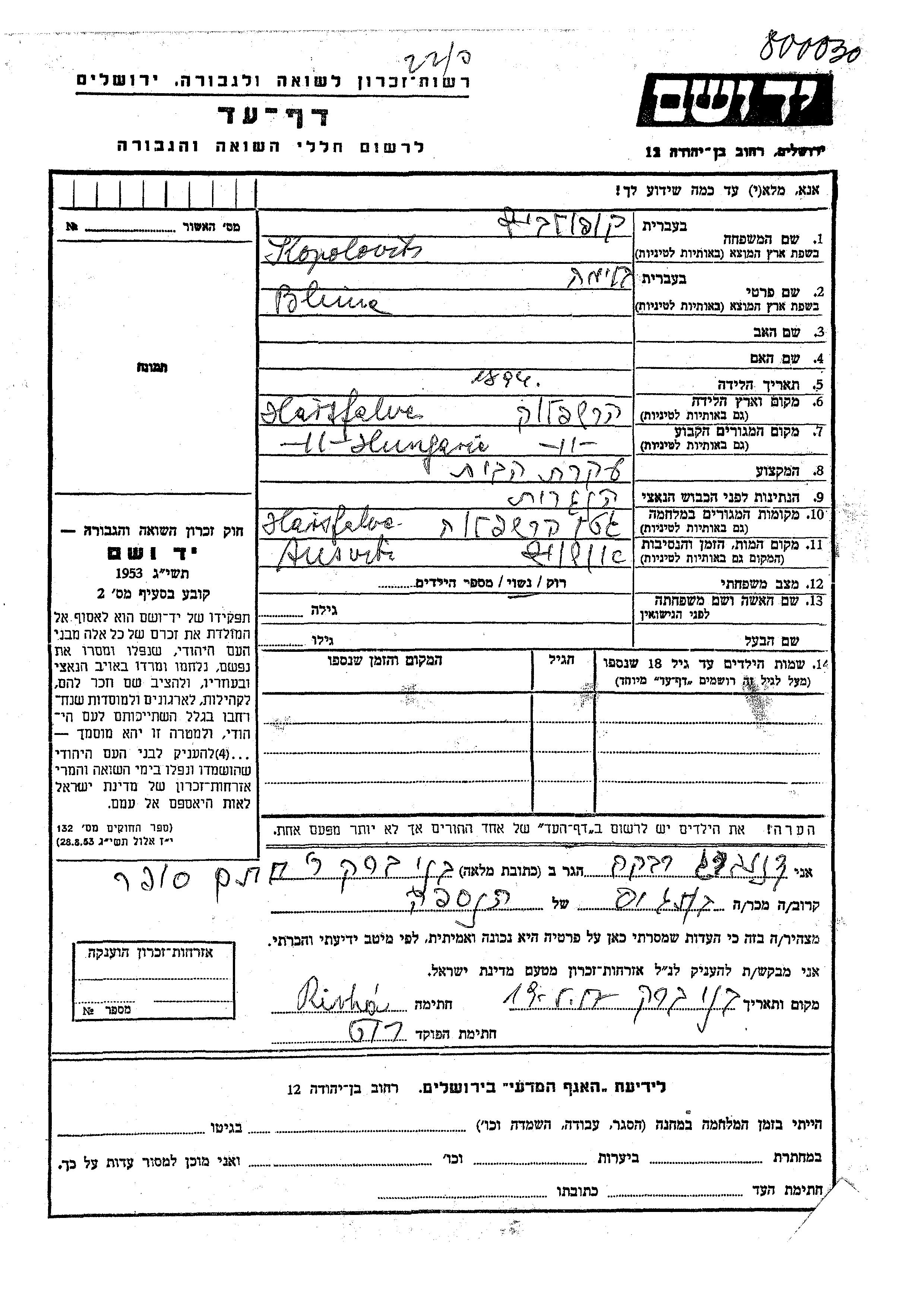 Яд Вашем - Листы свидетельских показаний Мемориального фонда