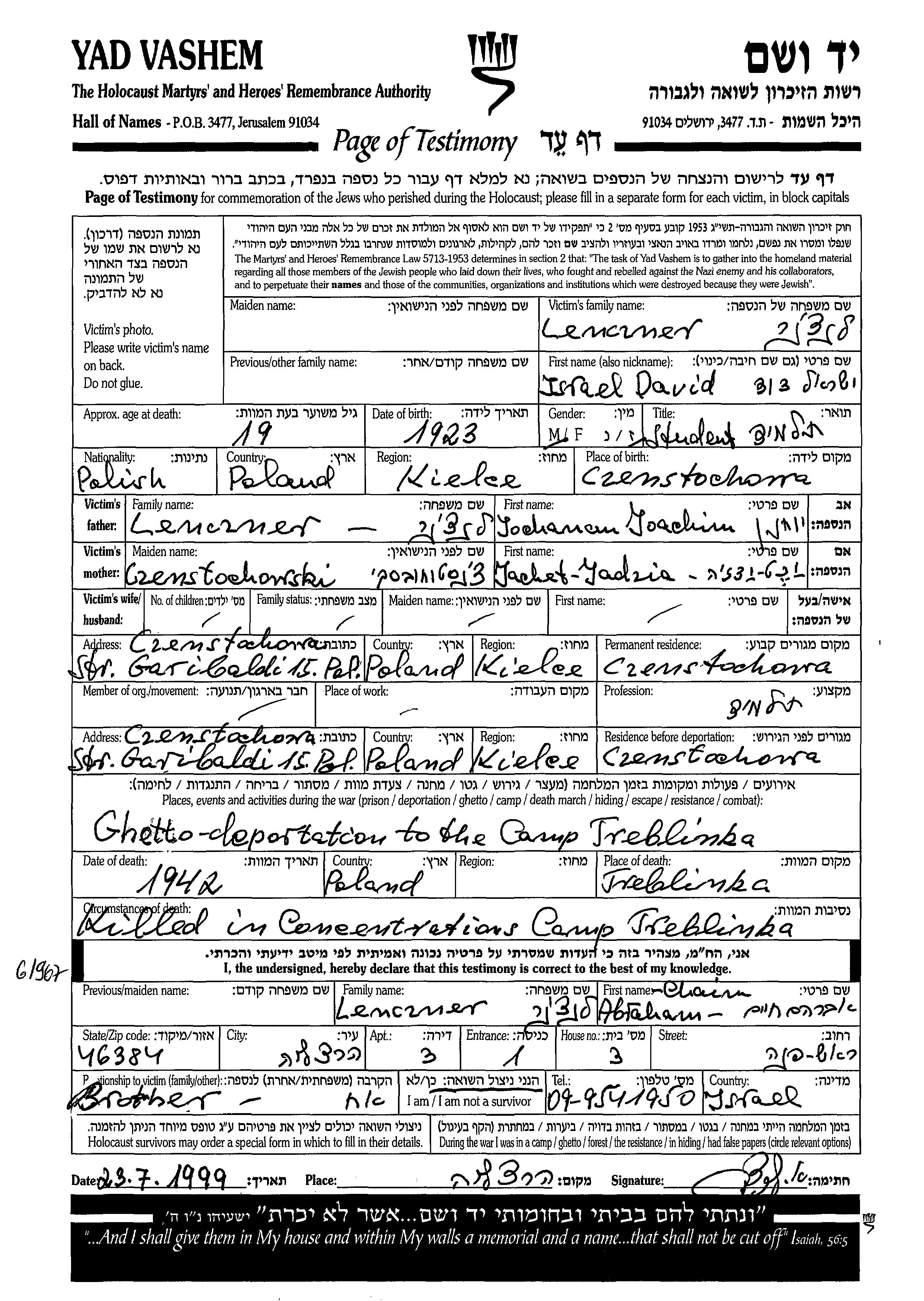 Ленчнер Исраэль Давид 1923 Ченстохова, Польша Лист свидетельских показаний