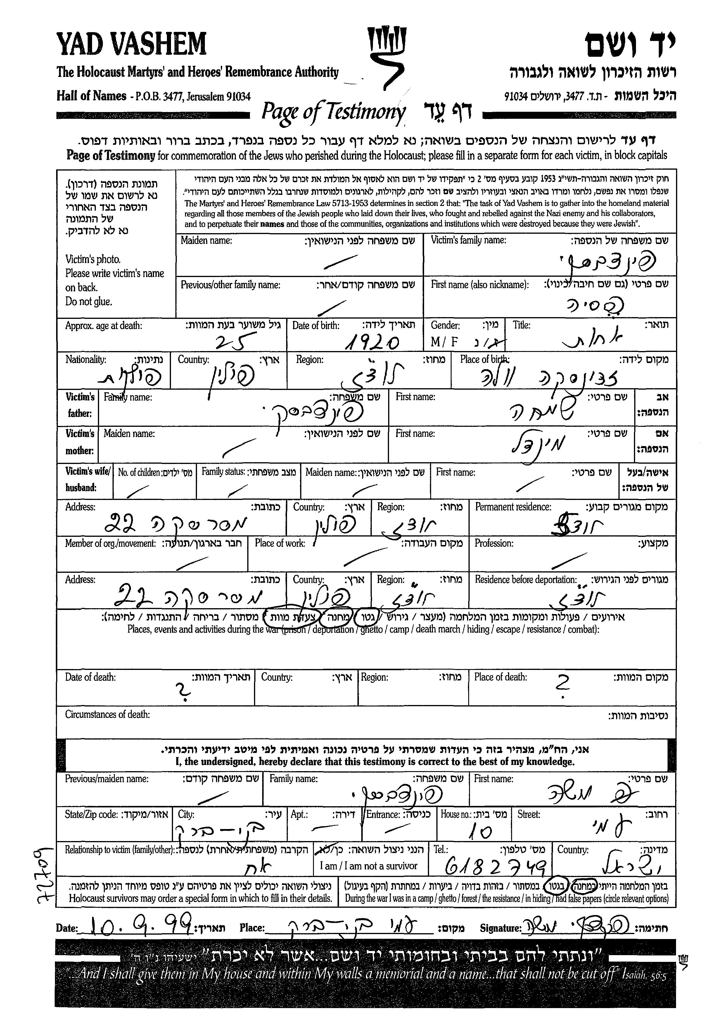 Яд Вашем - Листы свидетельских показаний Мемориального фонда
