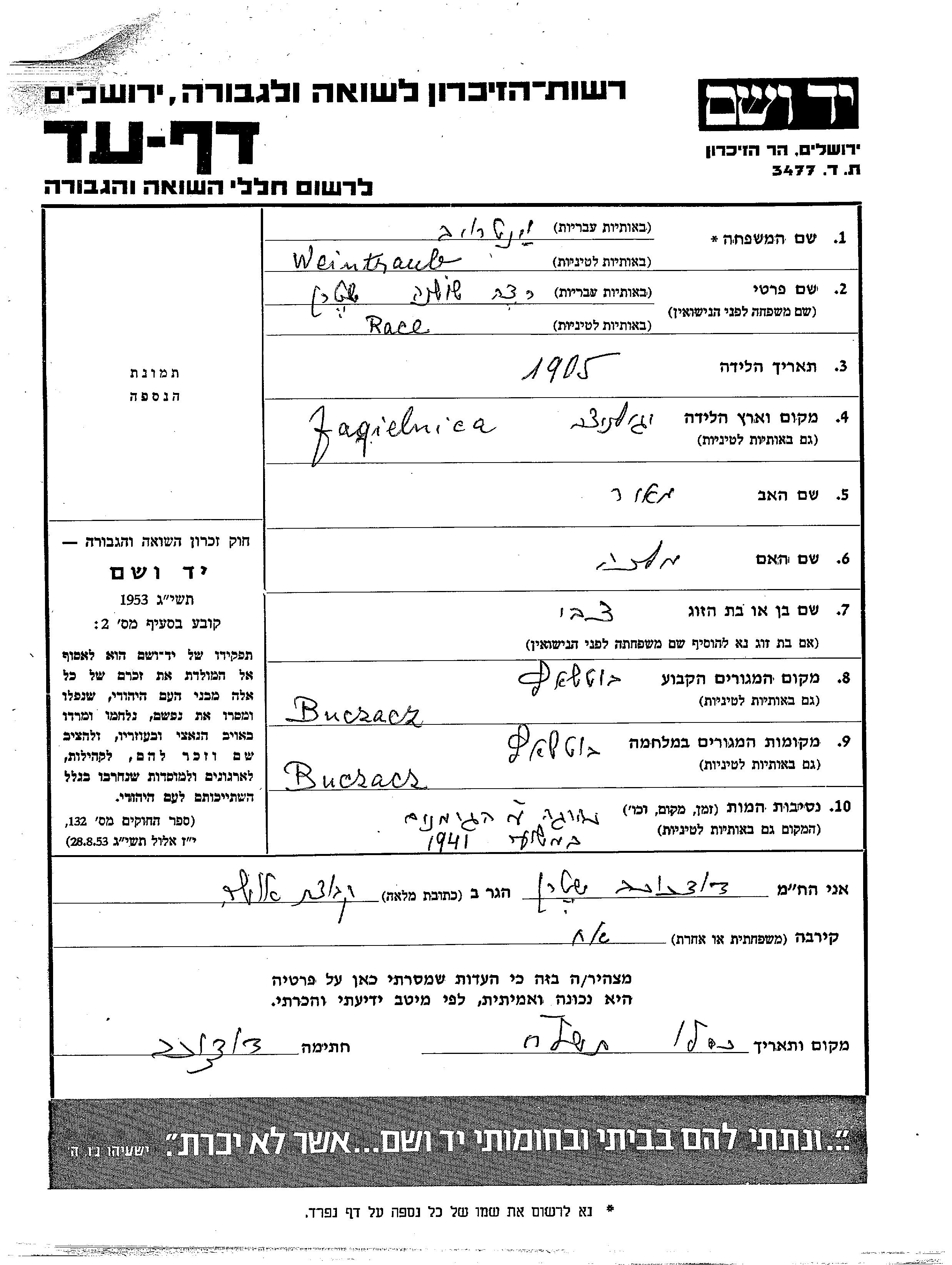 Раце Шошана Вейнтрауб, девичья фамилия Штерн, место рождения: Ягельница, Польша. Место жительства до войны: Бучач, Польша.