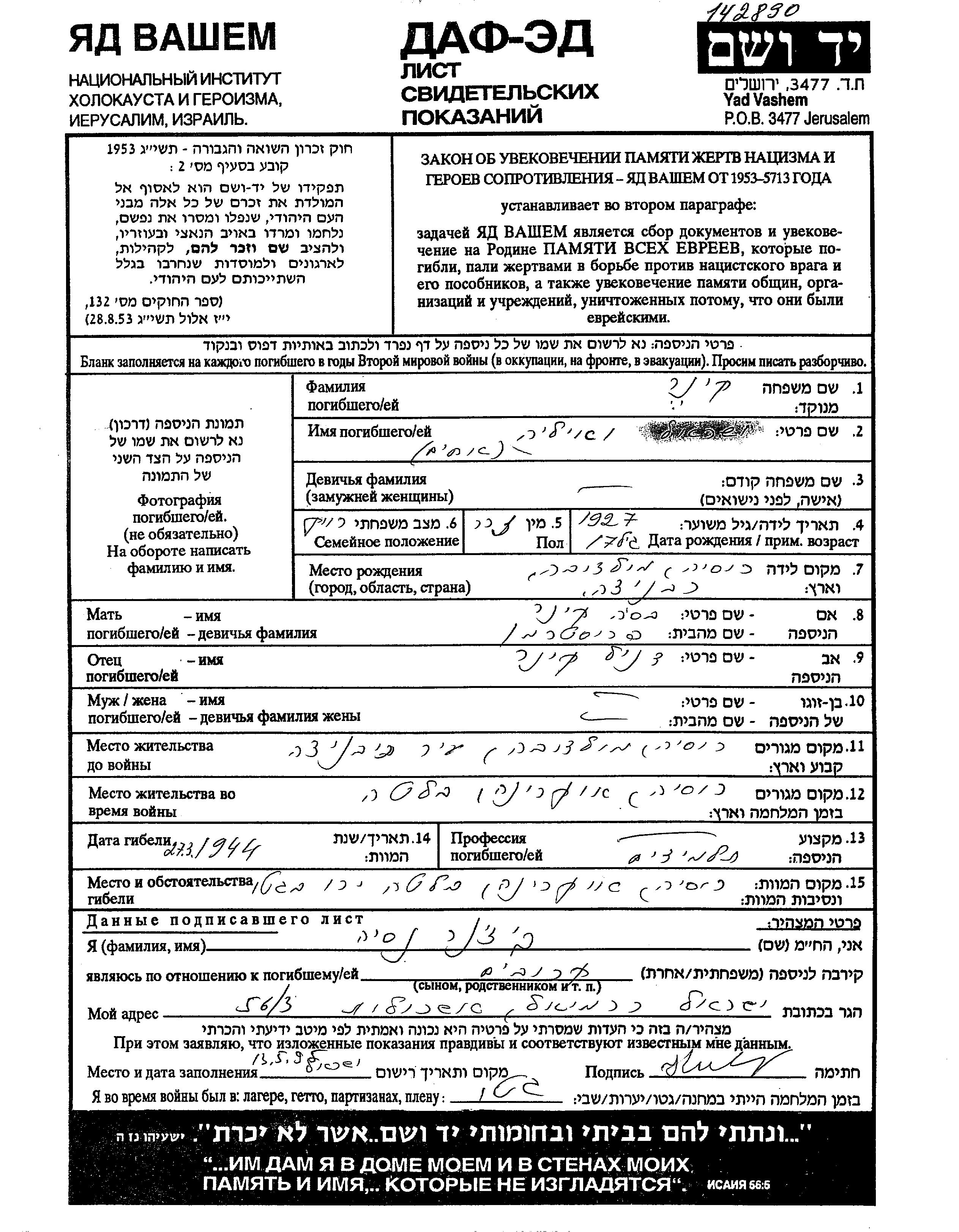 Яд Вашем - Листы свидетельских показаний Мемориального фонда