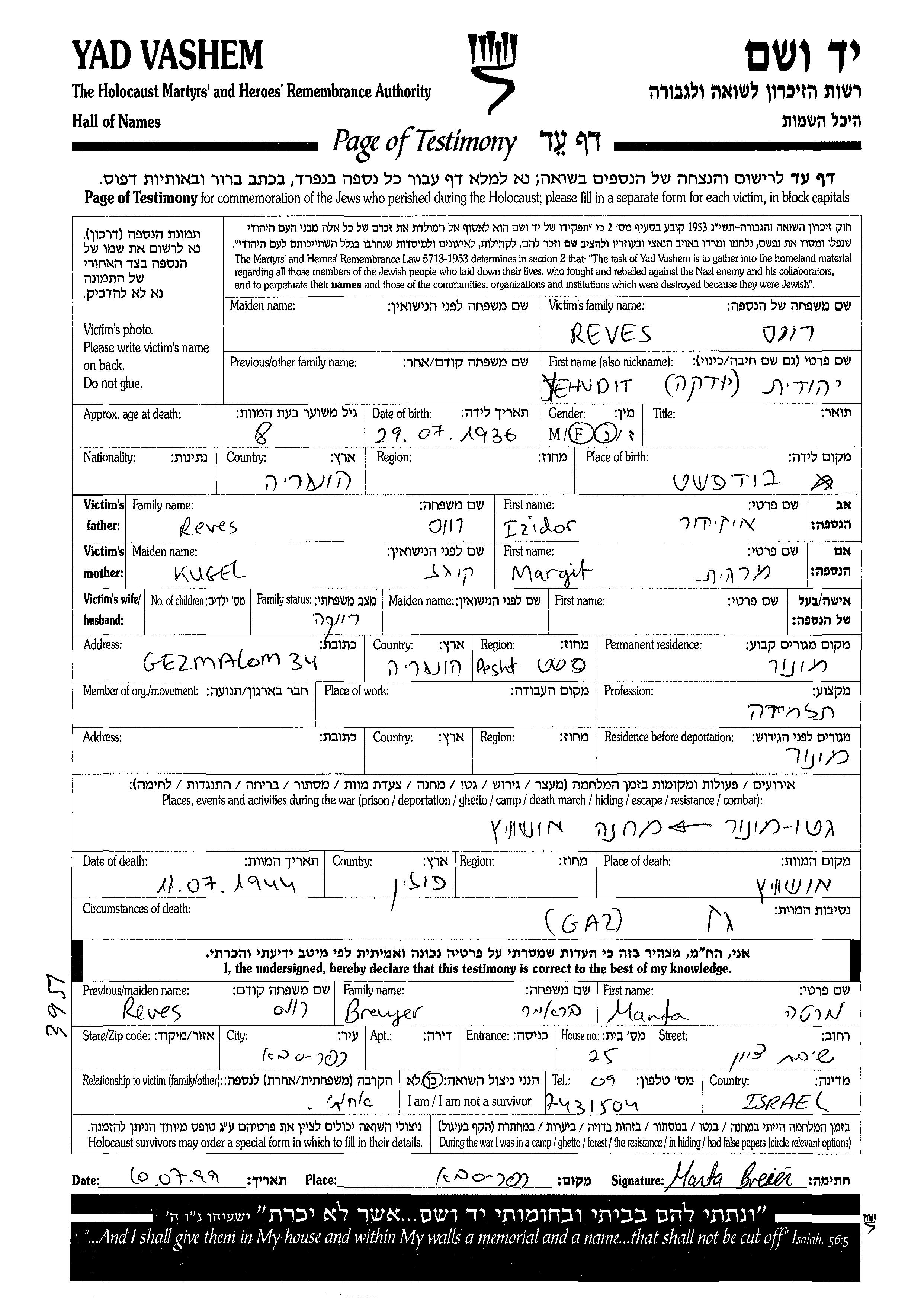 Ревес Иегудит Юдка 1936 Монор, Венгрия Лист свидетельских показаний