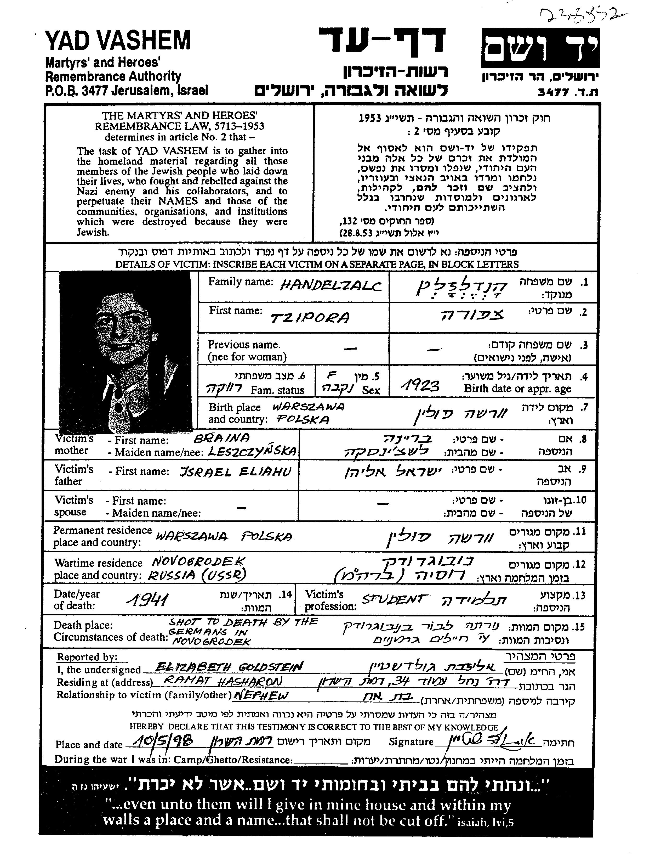 Хандельзальц | Ципора | 1923 | Варшава, Польша | Лист свидетельских показаний |