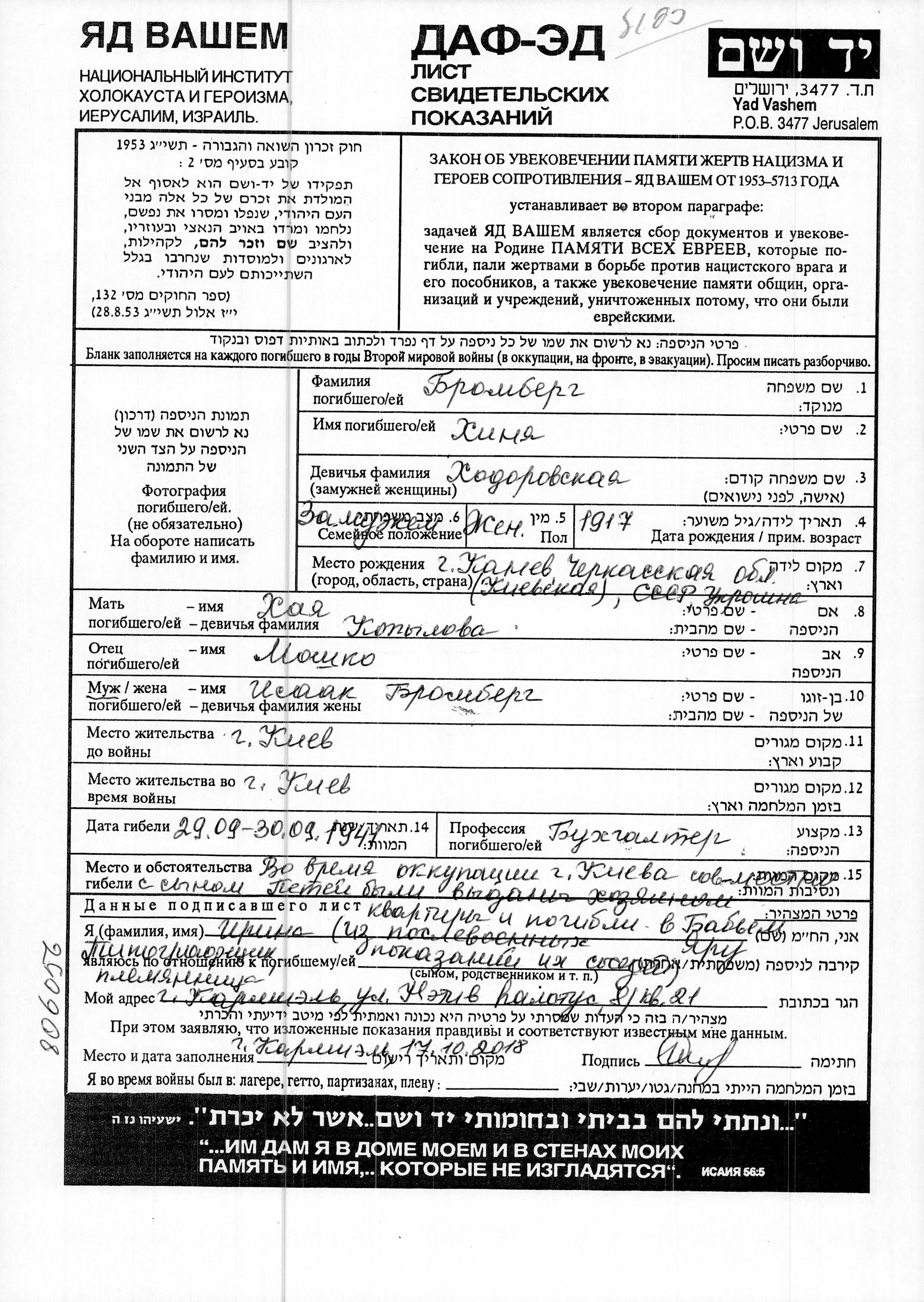 Бромберг | Хиня | 1917 | Киев, Украина (СССР) | Лист свидетельских показаний |