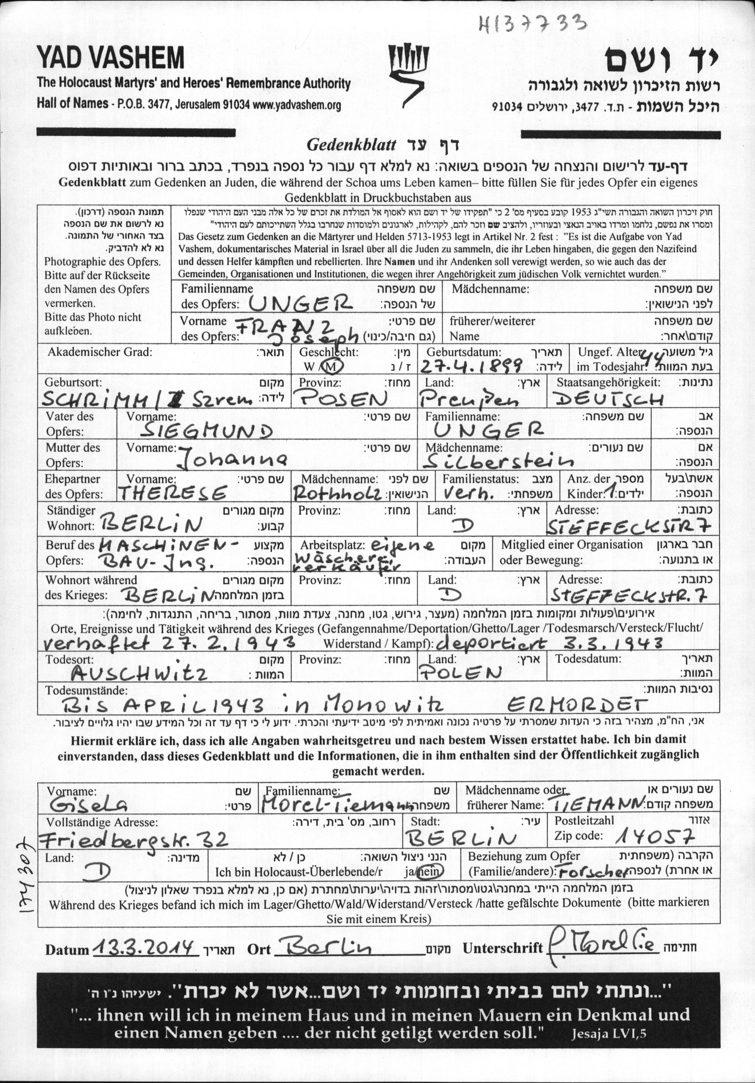 Унгер | Франц Йосеф | 1899 | Берлин, Германия | Список уничтоженных евреев из Германии |