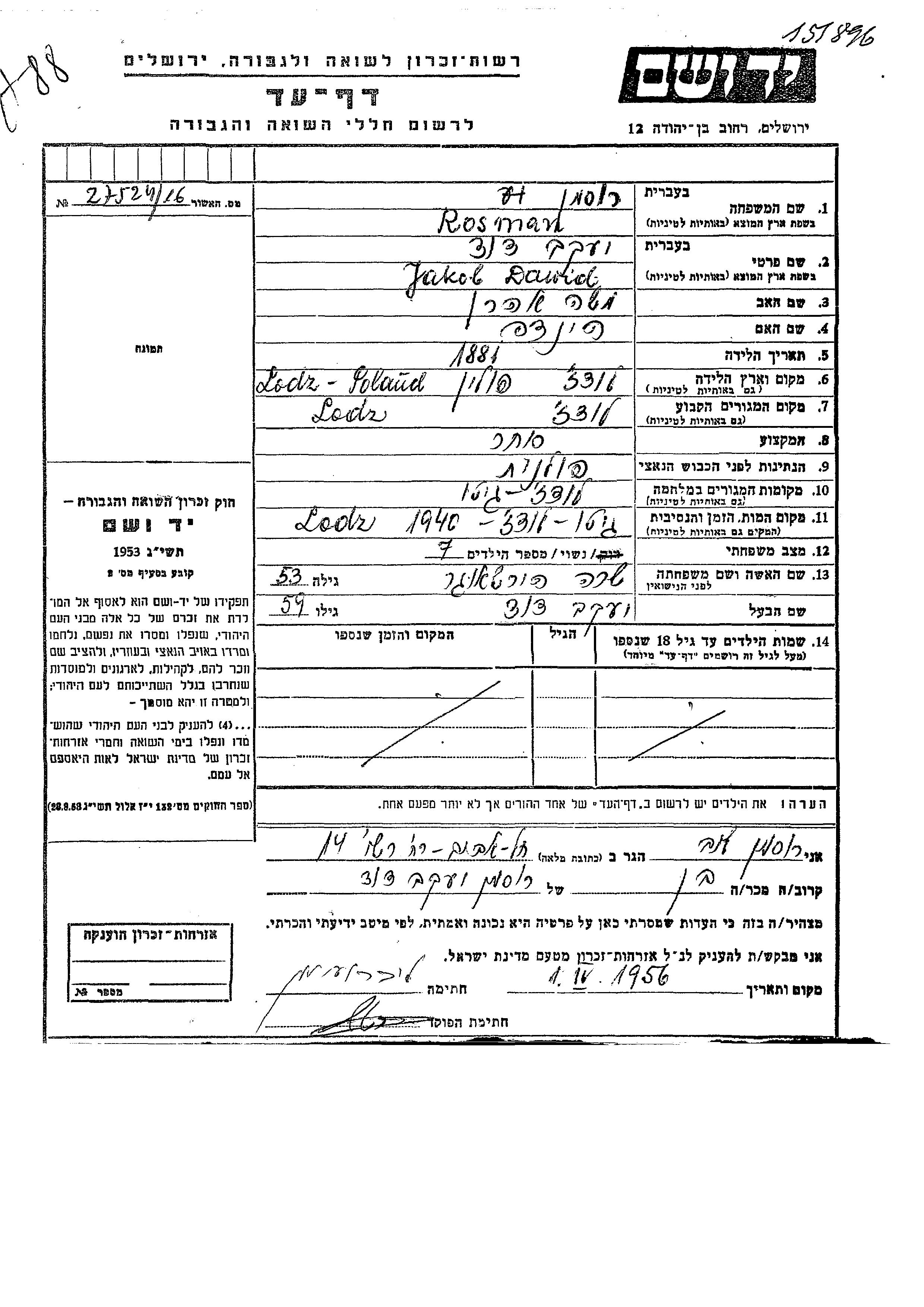 Росман | Якоб Давид | 1881 | Лодзь, Польша | Лист свидетельских показаний |