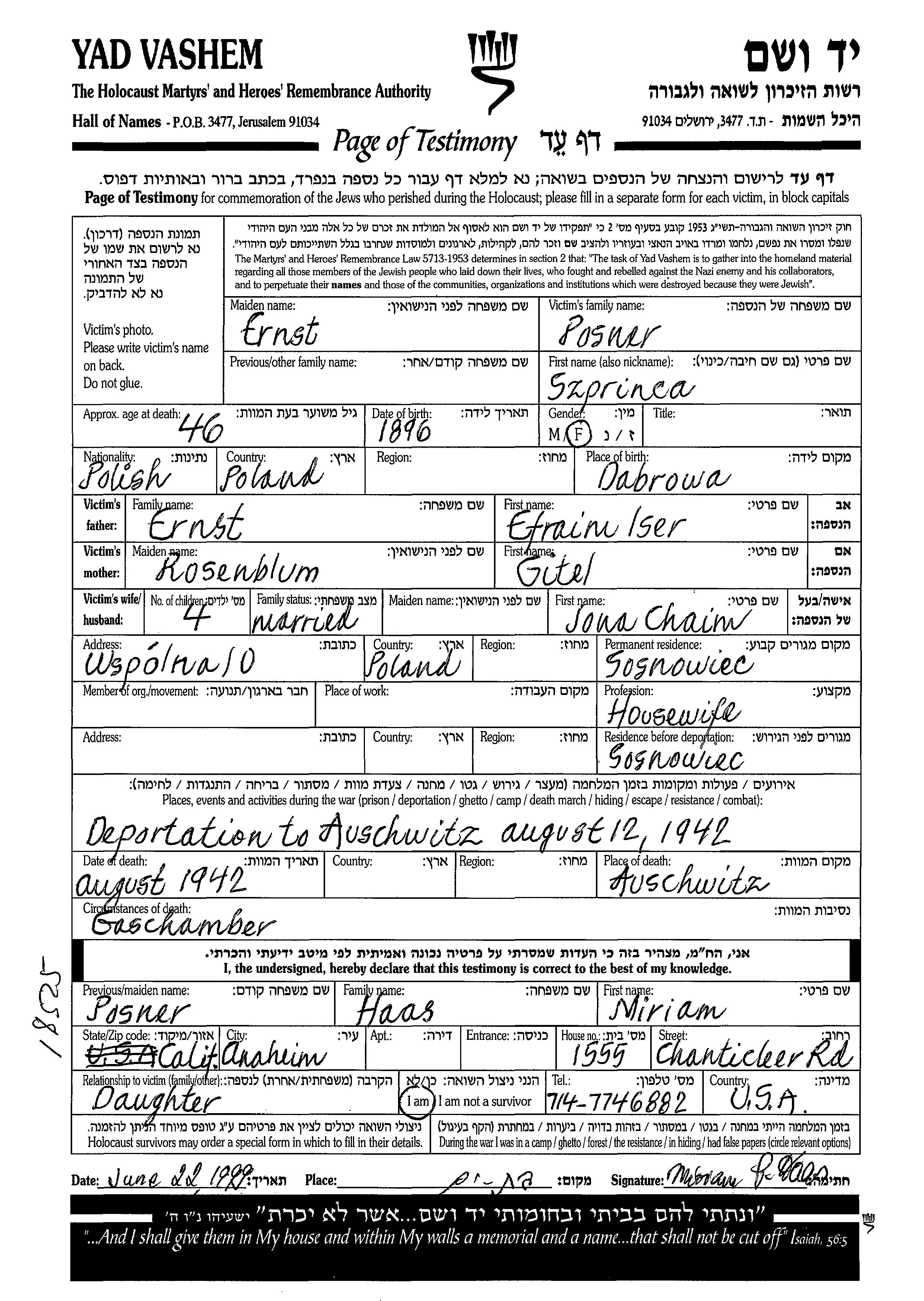Шпринца Познер, девичья фамилия Эрнст, место рождения: Dąbrowa, Польша. Домохозяйка. Место жительства до войны: Сосновец, Польша.