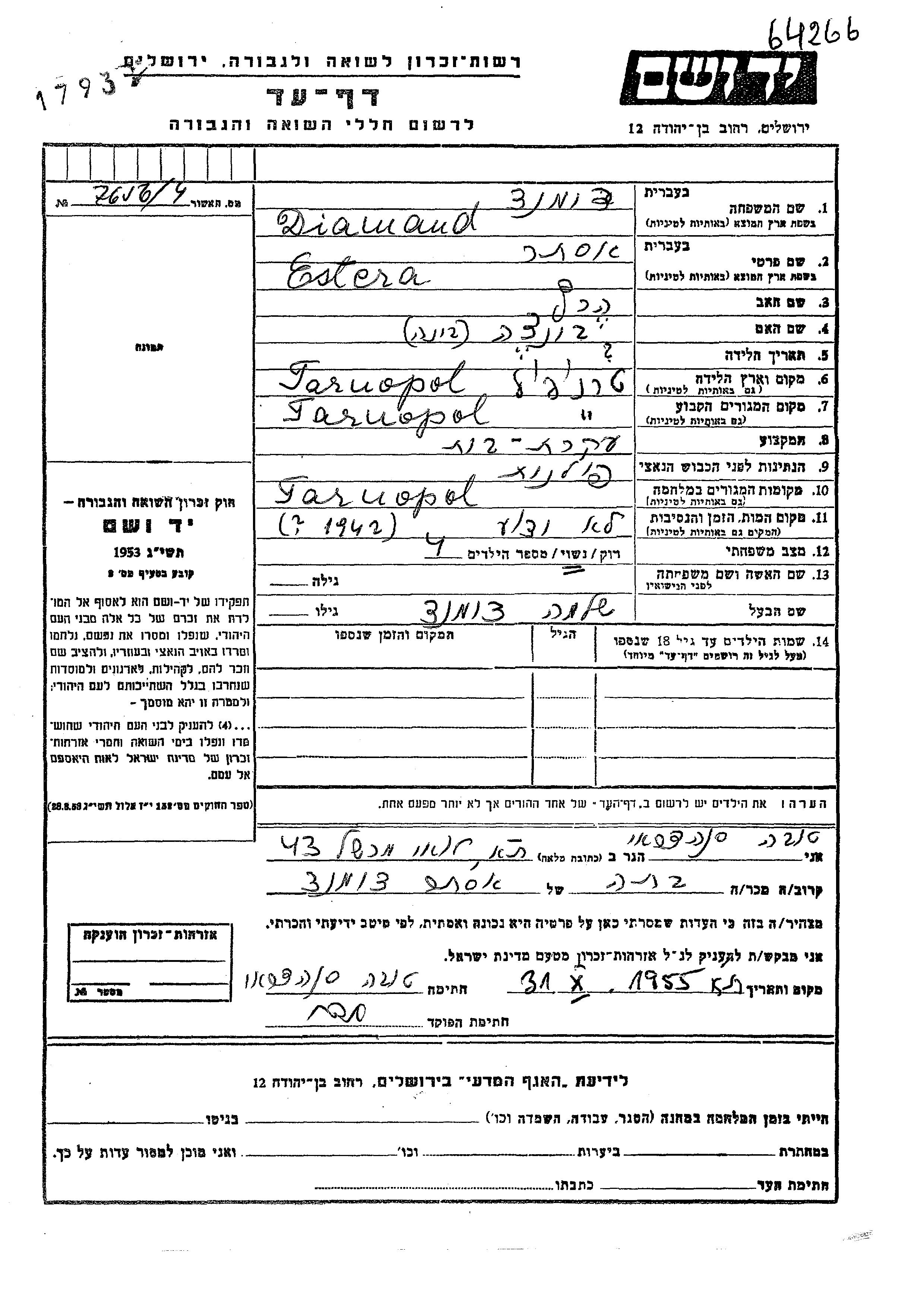 Диаманд | Эстера | Тарнополь, Польша | Лист свидетельских показаний | |
