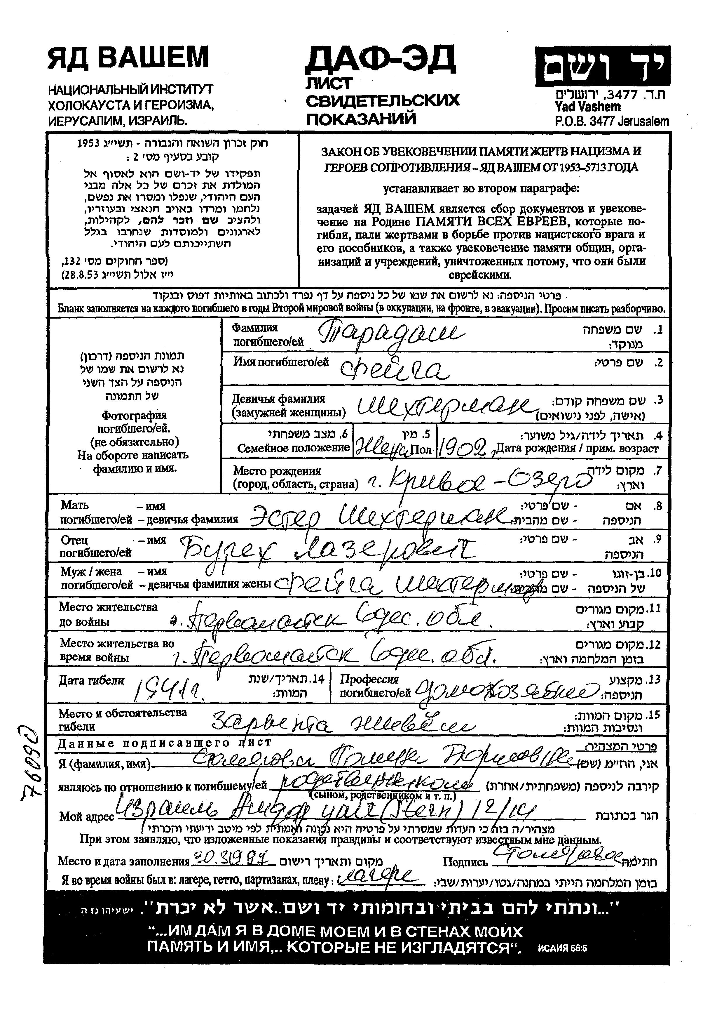 Яд Вашем - Листы свидетельских показаний Мемориального фонда