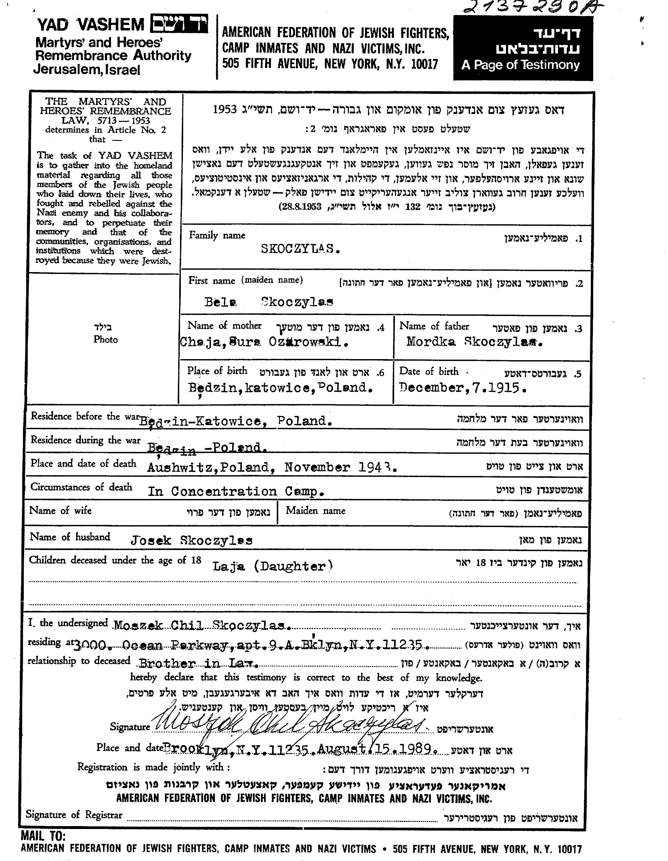 Скочилас Бела 1915 Бендзин, Польша Лист свидетельских показаний
