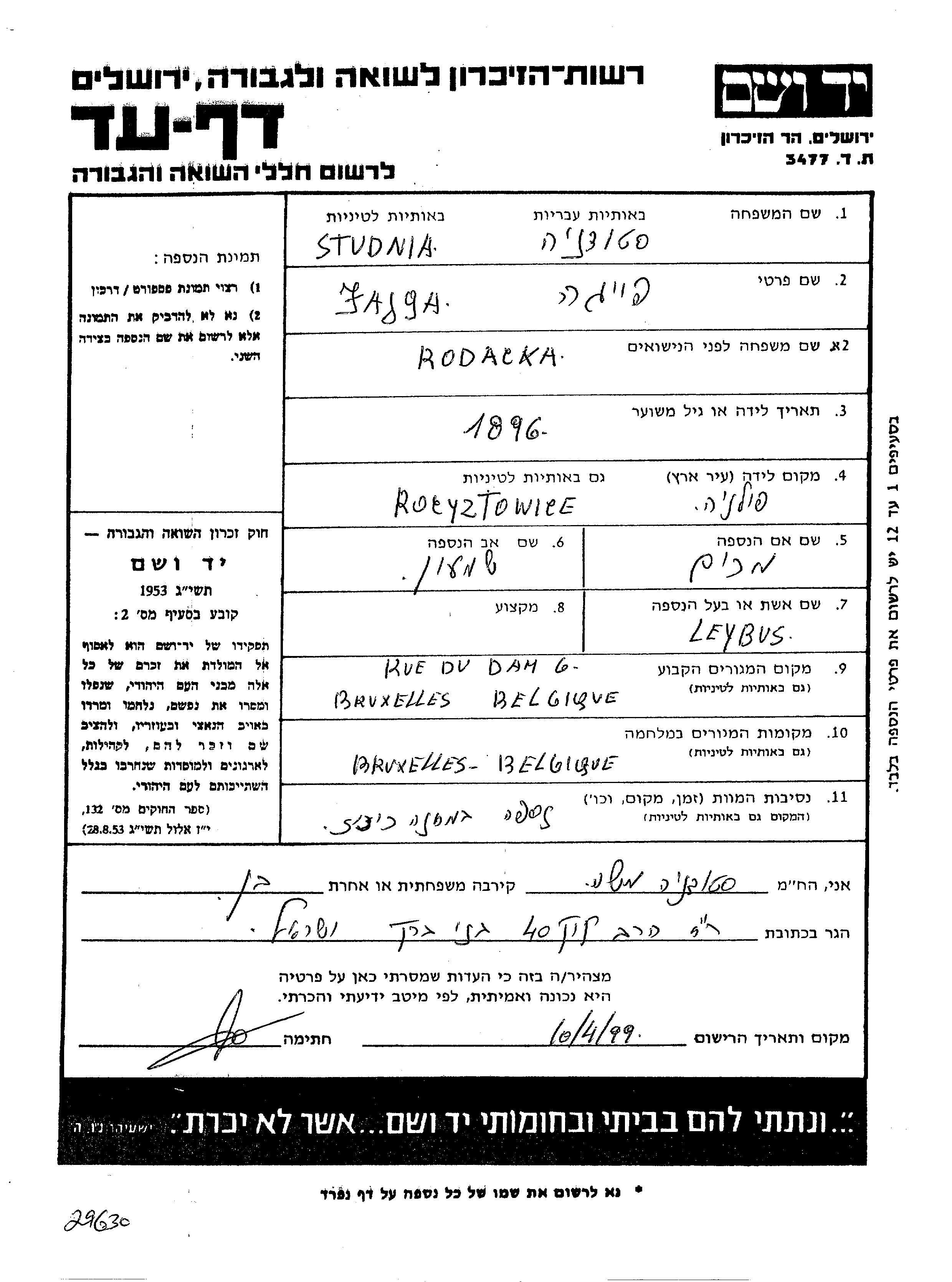 | Студня | Файга | 1896 | Брюссель, Бельгия | Лист свидетельских показаний |