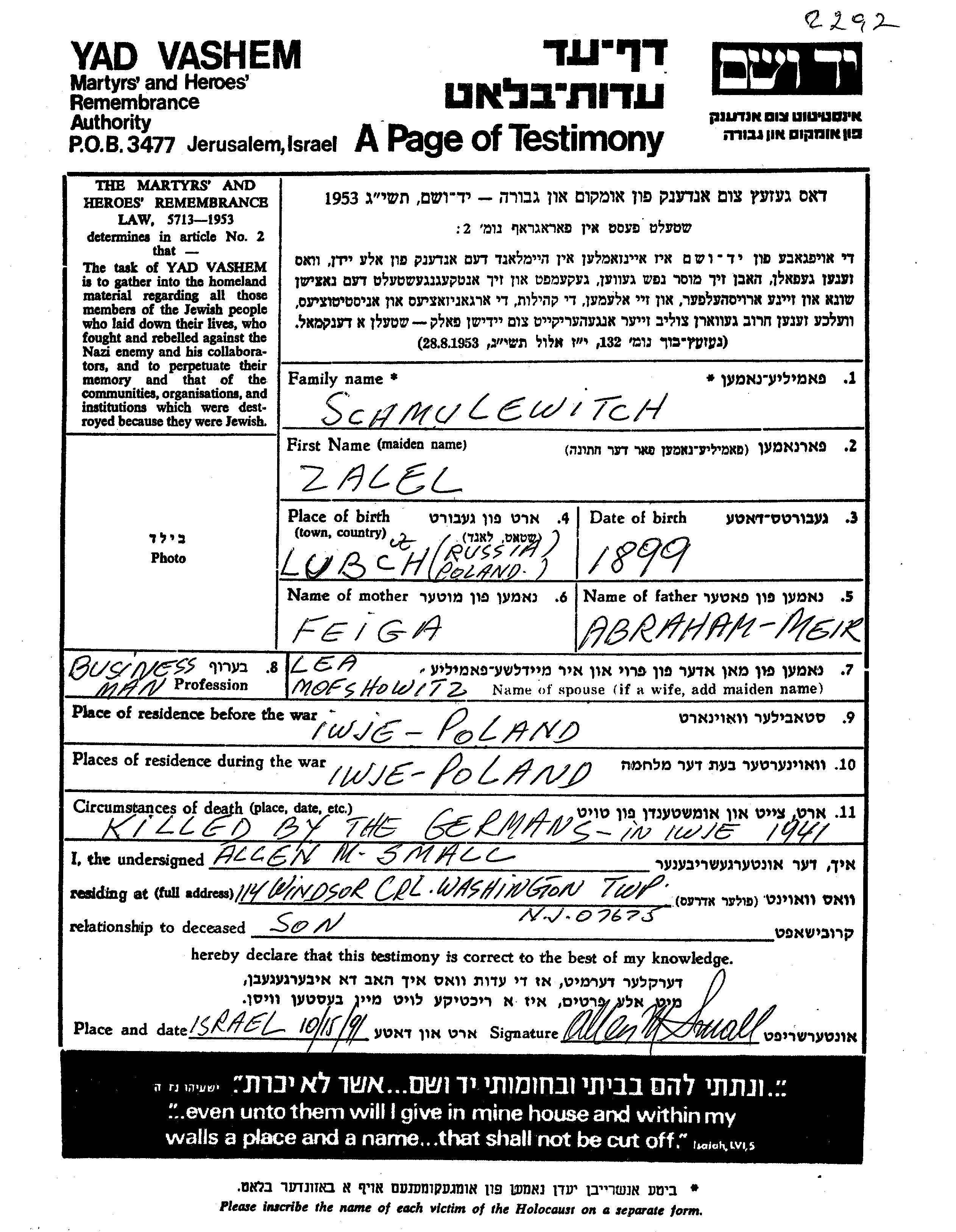 Бецалель Шмулёвич, место рождения: Любча, Польша. Место жительства до войны: Ивье, Польша.