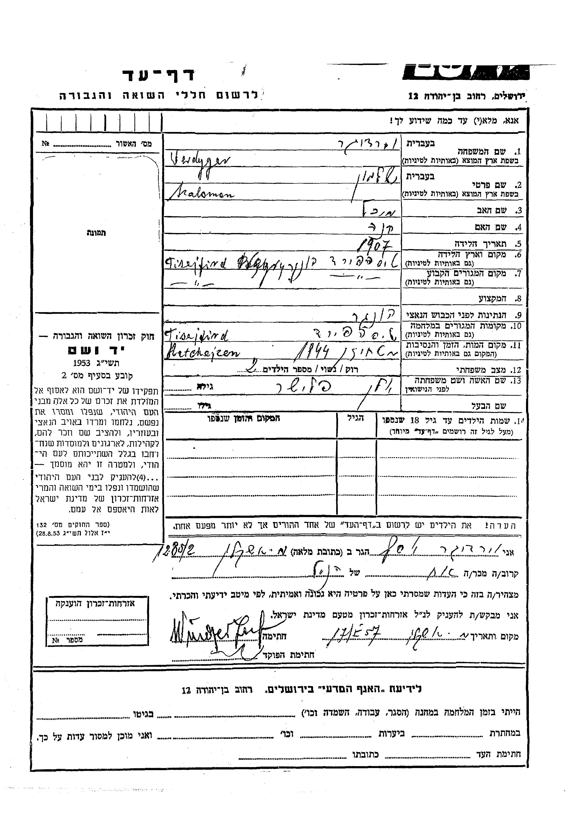 Вердигер Саломон 1907 Тисафюред, Венгрия Лист свидетельских показаний