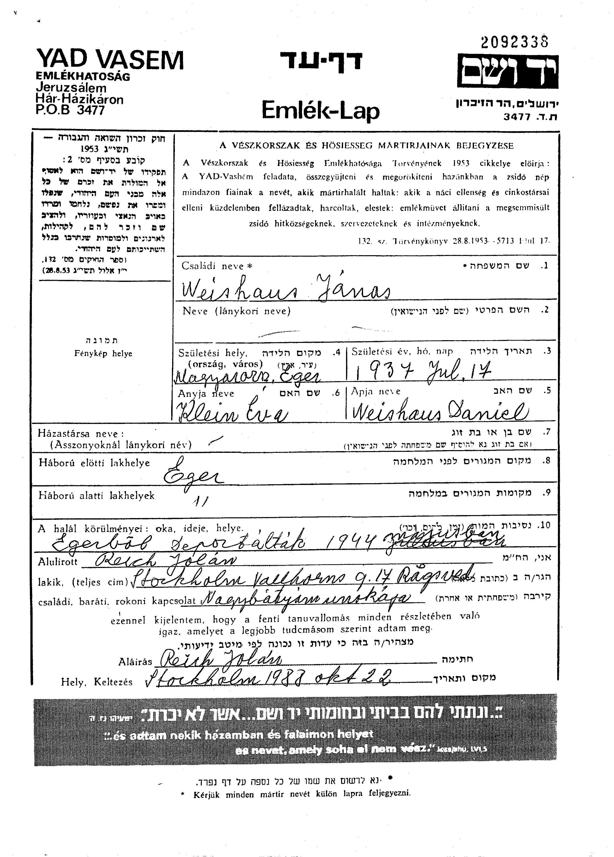 Янаш Вайссхауз, место рождения: Эгер, Венгрия. Место жительства до войны: Эгер, Венгрия.