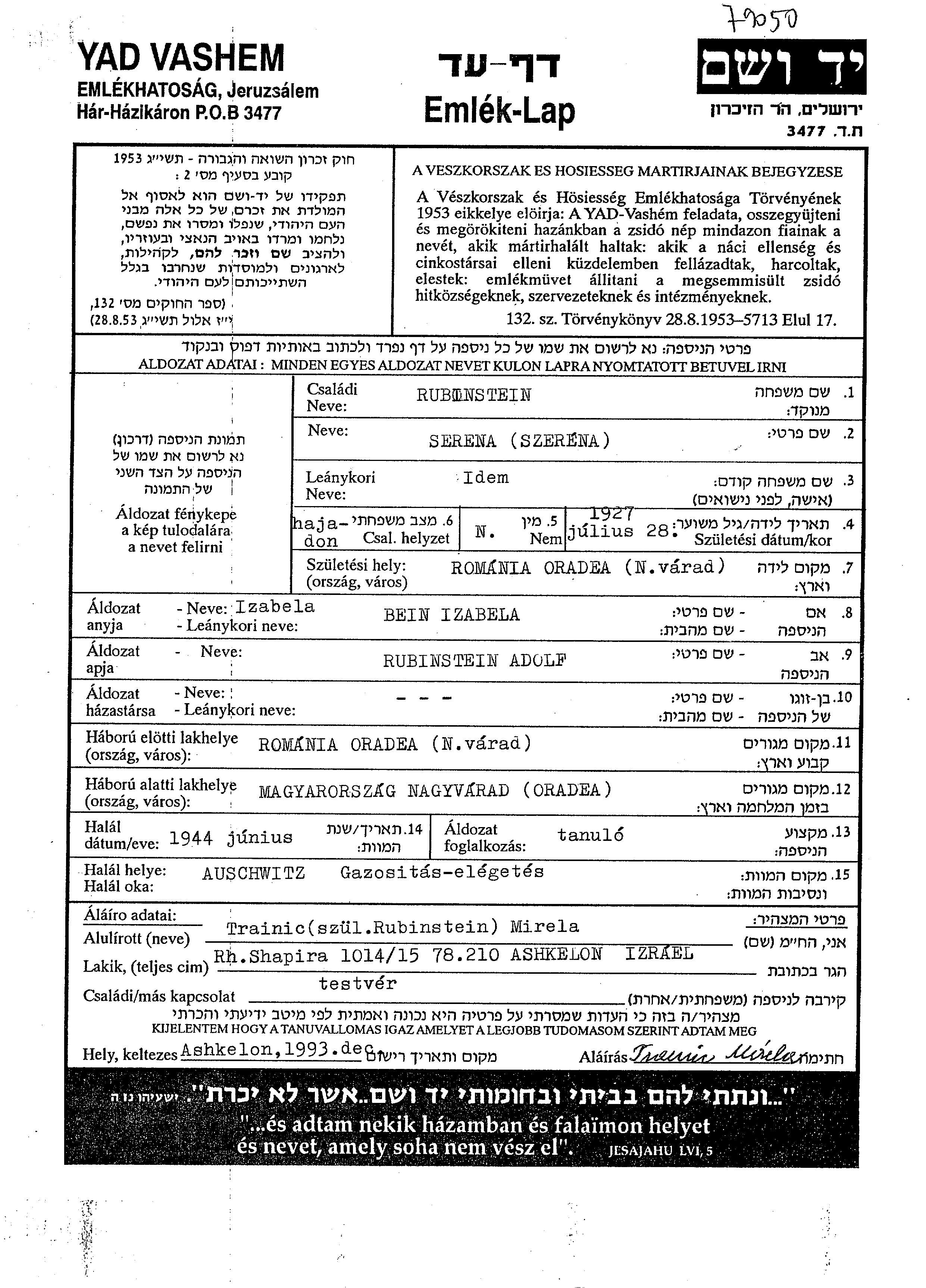 Серена Рубинштайн, место рождения: Надьварад, Румыния. Ученик / ученица. Место жительства до войны: Надьварад, Румыния.
