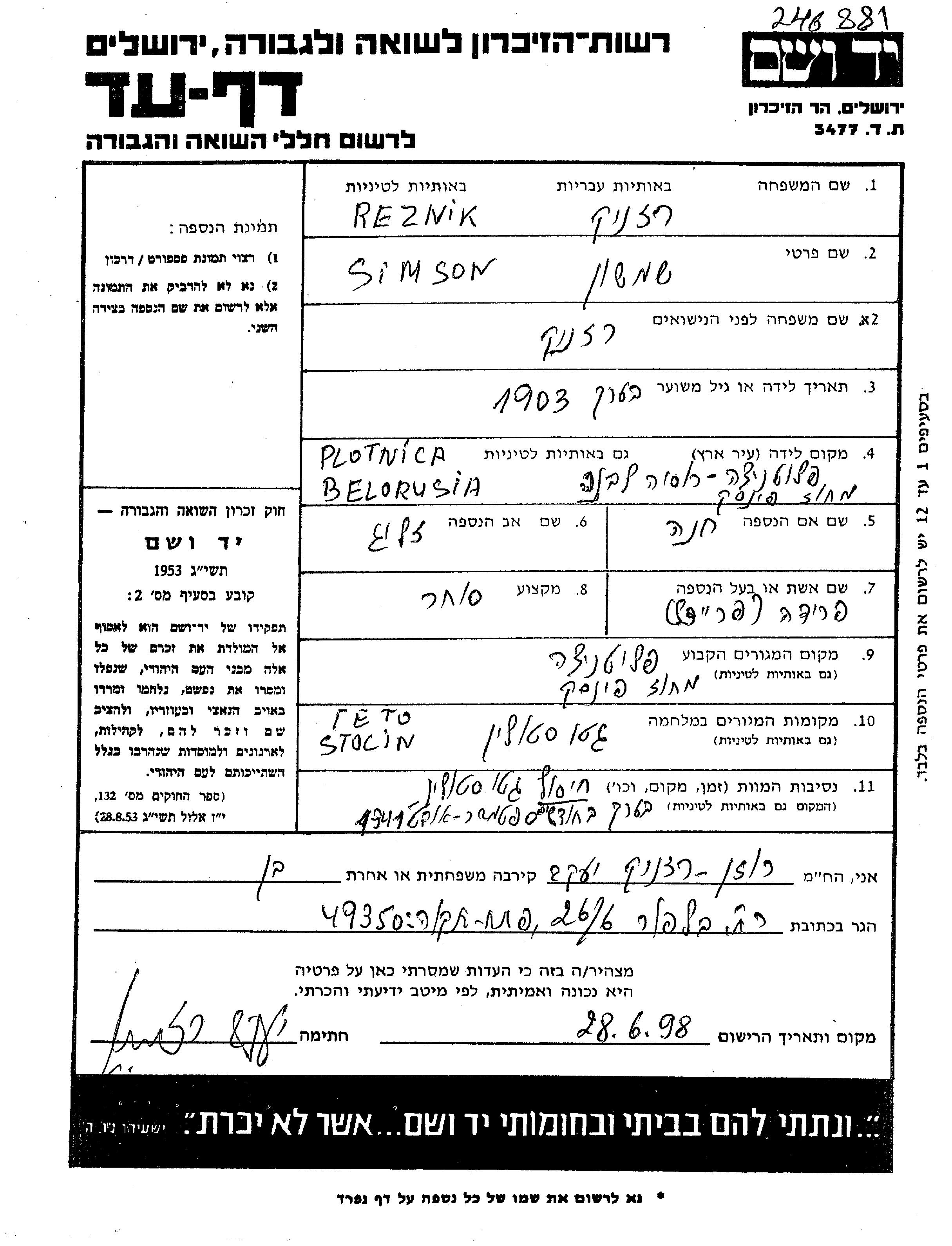 Резник | Шимшон | Плотница, Польша | Лист свидетельских показаний |