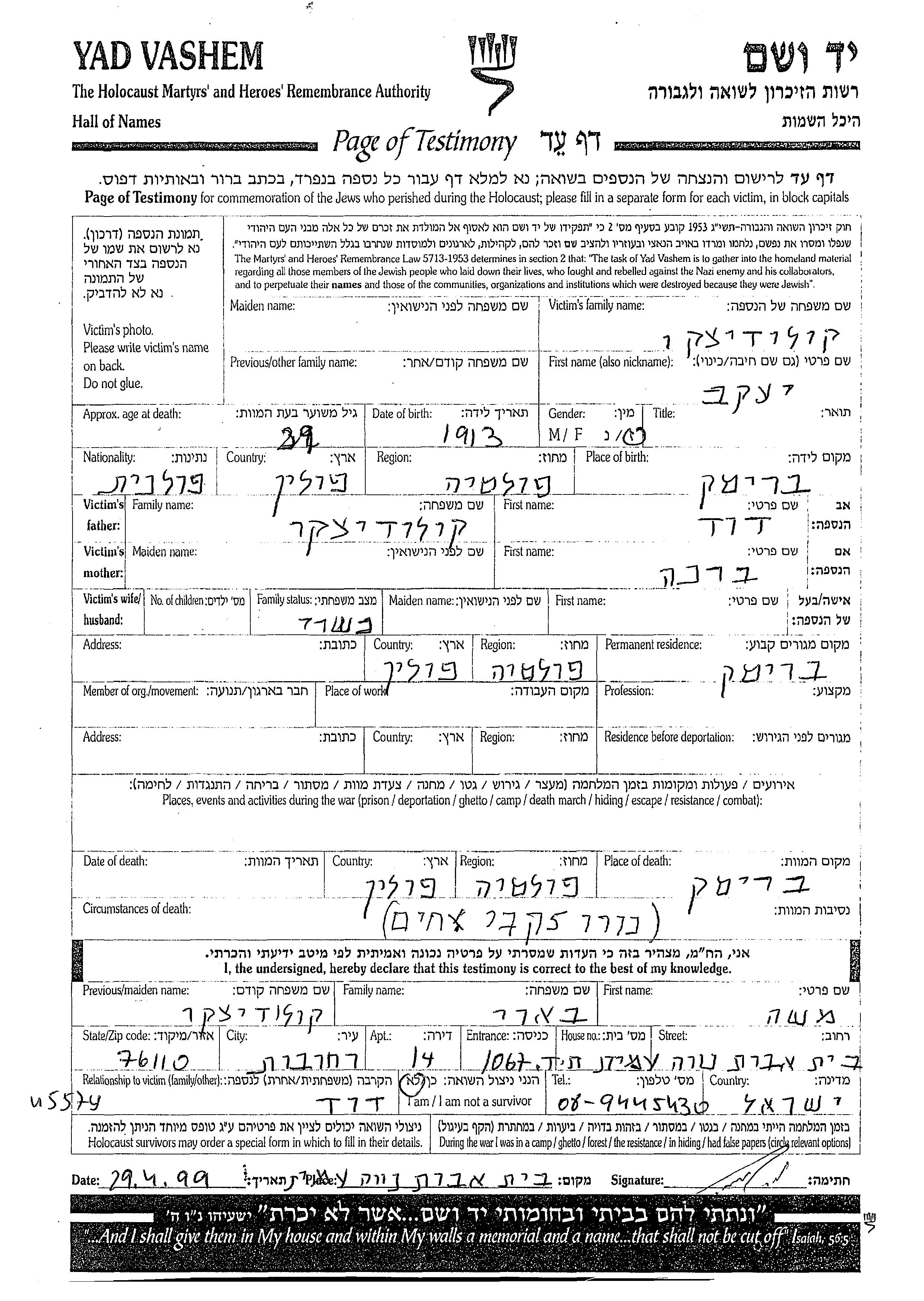 Яд Вашем - Листы свидетельских показаний Мемориального фонда