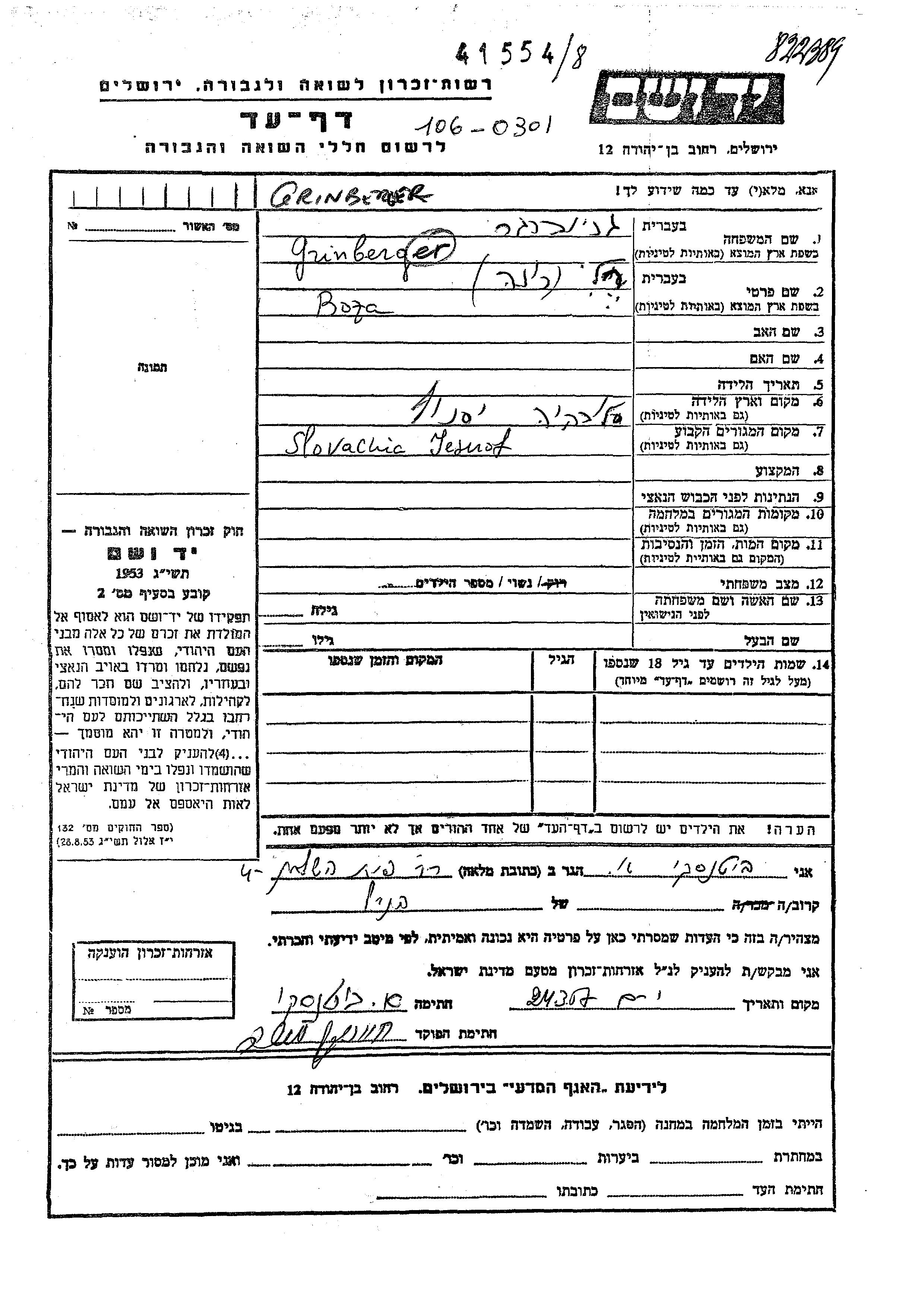 Рели Роза Гринбергер, место рождения: Солобковцы, Украина (СССР). Женат / замужем. Место жительства до войны: Словакия, Чехословакия.