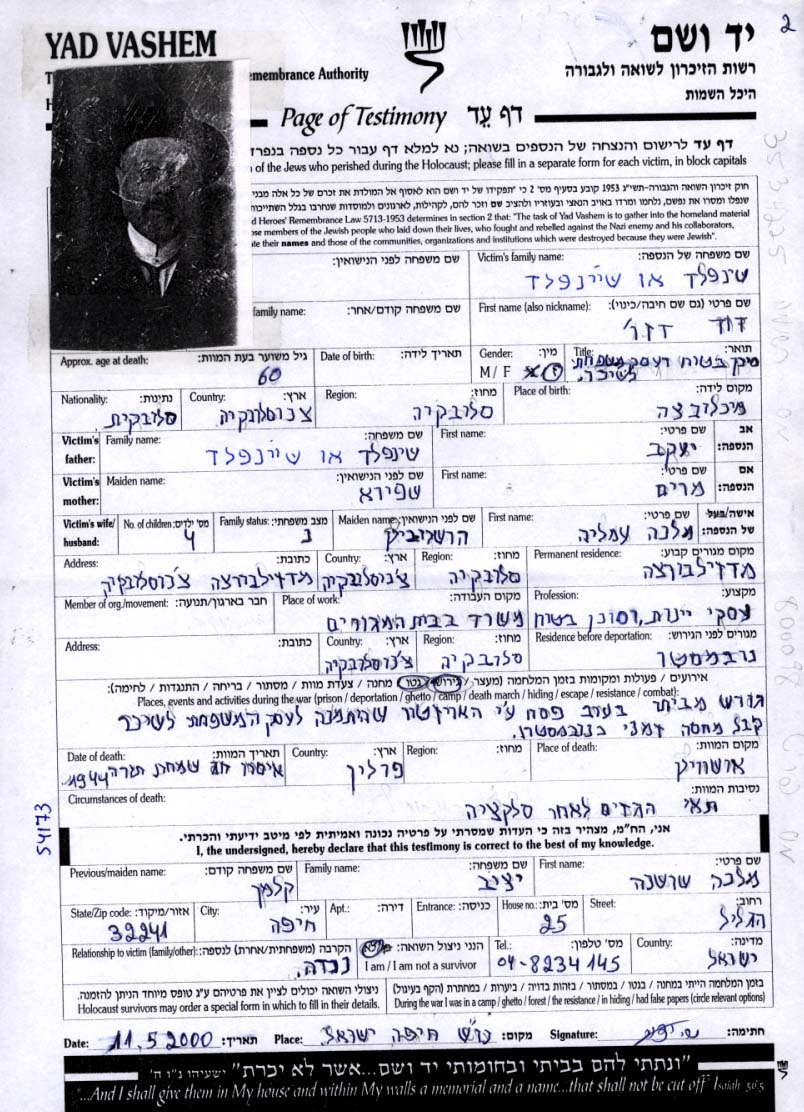 Шейнфельд | Давид Дежо | Медзилаборце, Чехословакия | Лист свидетельских показаний | |